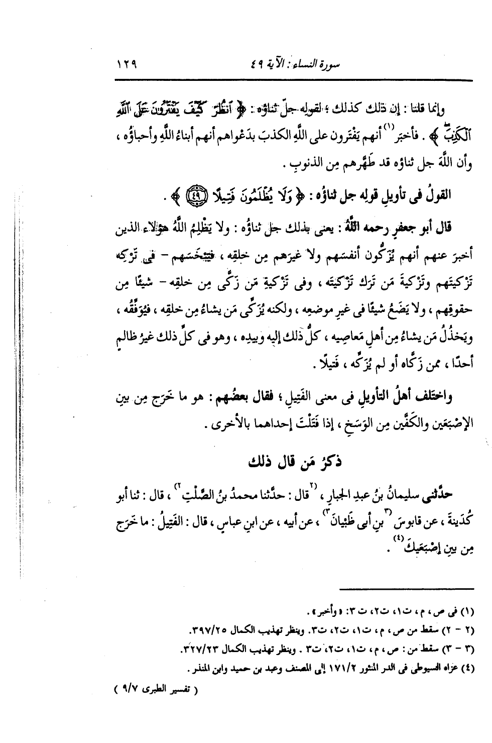 §الْقَوْلُ فِي تَأْوِيلِ قَوْلِهِ تَعَالَى: {وَلَا يُظْلَمُونَ فَتِيلًا} [النساء: 49] يَعْنِي بِذَلِكَ جَلَّ ثَنَاؤُهُ: وَلَا يَظْلِمُ اللَّهُ هَؤُلَاءِ الَّذِينَ أَخْبَرَ عَنْهُمْ أَنَّهُمْ يُزَكُّونَ أَنْفُسَهُمْ وَلَا غَيْرَهُمْ مِنْ خَلْقِهِ , فَيَبْخَسُهُمْ فِي تَرْكِهِ تَزْكِيَتَهُمْ , وَتَزْكِيَةِ مَنْ تَرَكَ تَزْكِيَتَهُ , وَفِي تَزْكِيَةِ مَنْ زَكَّى مِنْ خَلْقِهِ شَيْئًا مِنْ حُقُوقِهِمْ وَلَا يَضَعُ شَيْئًا فِي غَيْرِ مَوْضِعِهِ , وَلَكِنَّهُ يُزَكِّي مَنْ يَشَاءُ مِنْ خَلْقِهِ , فَيُوَفِّقُهُ , وَيَخْذُلُ مَنْ يَشَاءُ مِنْ أَهْلِ مَعَاصِيهِ؛ كُلُّ ذَلِكَ إِلَيْهِ وَبِيَدِهِ , وَهُوَ فِي كُلِّ ذَلِكَ غَيْرُ ظَالِمٍ أَحَدًا مِمَّنْ زَكَّاهُ أَوْ لَمْ يُزَكِّهِ فَتِيلًا. وَاخْتَلَفَ أَهْلُ التَّأْوِيلِ فِي مَعْنَى الْفَتِيلِ , فَقَالَ بَعْضُهُمْ: هُوَ مَا خَرَجَ مِنْ بَيْنَ الْأُصْبُعَيْنِ وَالْكَفَّيْنِ مِنَ الْوَسَخِ إِذَا فَتَلْتَ إِحْدَاهُمَا بِالْأُخْرَى