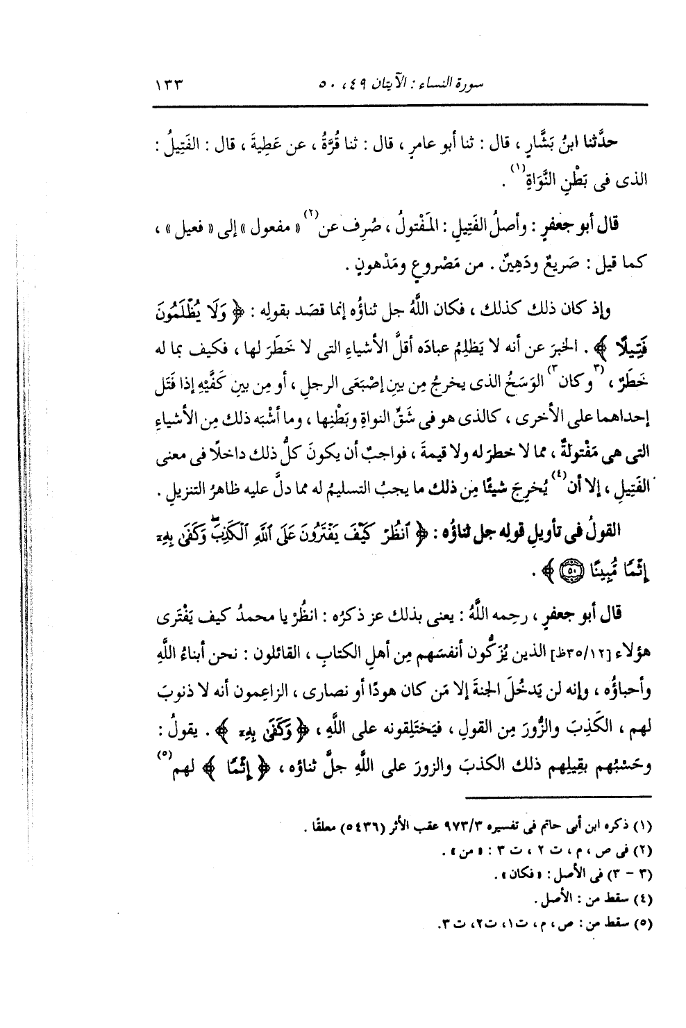 حَدَّثَنَا ابْنُ بَشَّارٍ , قَالَ: ثنا أَبُو عَامِرٍ , قَالَ: ثنا قُرَّةُ , عَنْ عَطِيَّةَ , قَالَ: §الْفَتِيلُ: الَّذِي فِي بَطْنِ النَّوَاةِ " قَالَ أَبُو جَعْفَرٍ: وَأَصْلُ الْفَتِيلِ: الْمَفْتُولُ , صُرِفَ مِنْ مَفْعُولٍ إِلَى فَعِيلٍ , كَمَا قِيلَ: صَرِيعٌ وَدَهِينٌ مِنْ مَصْرُوعٍ وَمَدْهُونٍ. وَإِذْ كَانَ ذَلِكَ كَذَلِكَ , وَكَانَ اللَّهُ جَلَّ ثَنَاؤُهُ إِنَّمَا قَصَدَ بِقَوْلِهِ: {وَلَا يُظْلَمُونَ فَتِيلًا} [النساء: 49] الْخَبَرَ عَنْ أَنَّهُ لَا يَظْلِمْ عِبَادَهُ أَقَلَّ الْأَشْيَاءِ الَّتِي لَا خَطَرَ لَهَا , فَكَيْفَ بِمَا لَهُ خَطَرٌ , وَكَانَ الْوَسَخُ الَّذِي يَخْرُجُ مِنْ بَيْنِ أُصْبُعَيِ الرَّجُلِ أَوْ مِنْ بَيْنِ كَفَّيْهِ إِذَا فَتَلَ إِحْدَاهُمَا عَلَى الْأُخْرَى , كَالَّذِي هُوَ فِي شِقِّ النَّوَاةِ وَبَطْنِهَا , وَمَا أَشْبَهَ ذَلِكَ مِنَ الْأَشْيَاءِ الَّتِي هِيَ مَفْتُولَةٌ , مِمَّا لَا خَطَرَ لَهُ وَلَا قِيمَةَ , فَوَاجِبٌ أَنْ يَكُونَ كُلُّ ذَلِكَ دَاخِلَا فِي مَعْنَى الْفَتِيلِ , إِلَّا أَنْ يُخْرِجَ شَيْئًا مِنْ ذَلِكَ مَا يَجِبُ التَّسْلِيمُ لَهُ مِمَّا دَلَّ عَلَيْهِ ظَاهَرُ التَّنْزِيلِ