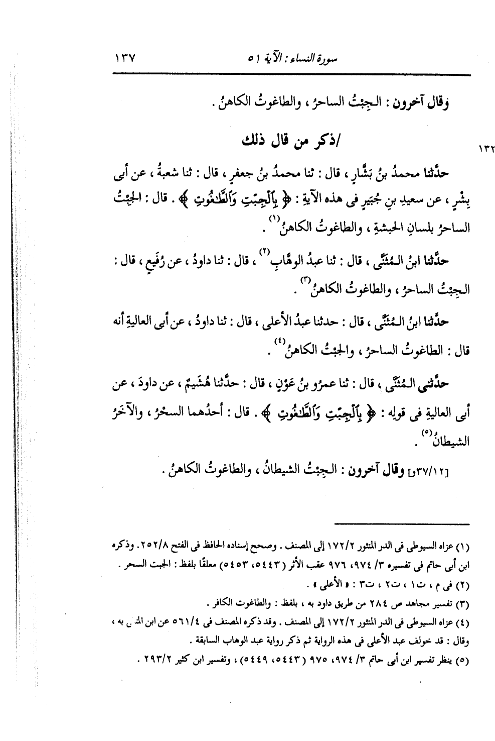 ذِكْرُ مَنْ قَالَ ذَلِكَ: حَدَّثَنَا ابْنُ بَشَّارٍ , قَالَ: ثنا مُحَمَّدُ بْنُ جَعْفَرٍ , قَالَ: ثنا شُعْبَةُ , عَنْ أَبِي بِشْرٍ , عَنْ سَعِيدِ بْنِ جُبَيْرٍ , فِي هَذِهِ الْآيَةِ: {§الْجِبْتِ وَالطَّاغُوتِ} قَالَ: " الْجِبْتُ: السَّاحِرُ بِلِسَانِ الْحَبَشَةِ , وَالطَّاغُوتُ: الْكَاهِنُ "