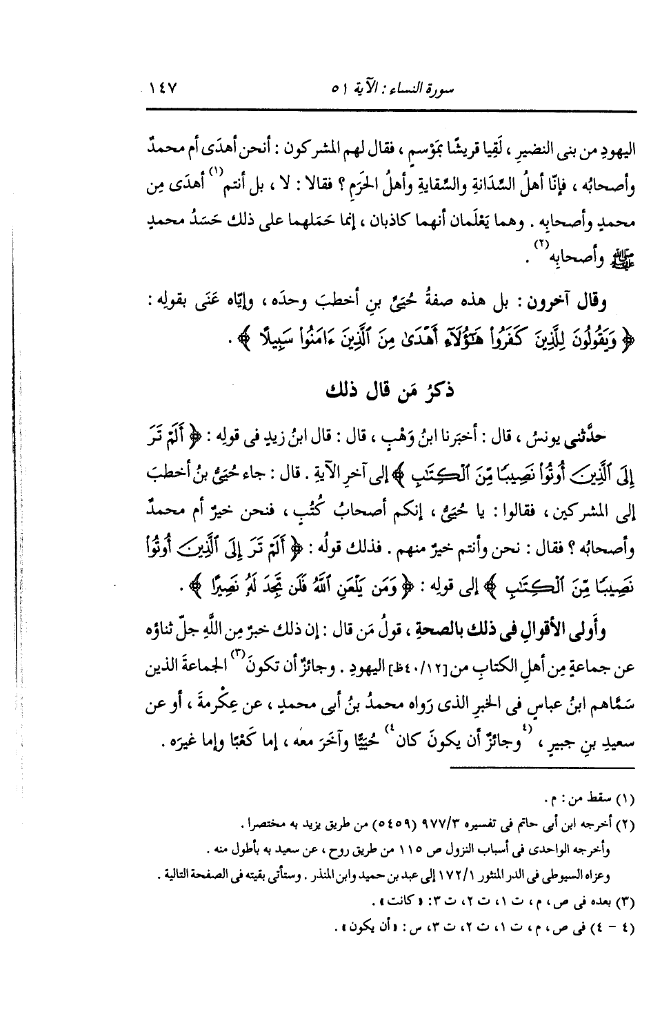 ذِكْرُ مَنْ قَالَ ذَلِكَ: حَدَّثَنِي يُونُسُ , قَالَ: أَخْبَرَنَا ابْنُ وَهْبٍ , قَالَ: قَالَ ابْنُ زَيْدٍ فِي قَوْلِهِ: {§أَلَمْ تَرَ إِلَى الَّذِينَ أُوتُوا نَصِيبًا مِنَ الْكِتَابِ} [آل عمران: 23] إِلَى آخِرِ الْآيَةِ قَالَ: جَاءَ حُيَيُّ بْنُ أَخْطَبَ إِلَى الْمُشْرِكِينَ , فَقَالُوا: يَا حُيَيُّ إِنَّكُمْ أَصْحَابُ كُتُبٍ , فَنَحْنُ خَيْرٌ أَمْ مُحَمَّدٌ وَأَصْحَابُهُ؟ فَقَالَ: نَحْنُ وَأَنْتُمْ خَيْرٌ مِنْهُمْ. فَذَلِكَ قَوْلُهُ: {أَلَمْ تَرَ إِلَى الَّذِينَ أُوتُوا نَصِيبًا مِنَ الْكِتَابِ} [آل عمران: 23] إِلَى قَوْلِهِ: {وَمَنْ يَلْعَنِ اللَّهُ فَلَنْ تَجِدَ لَهُ نَصِيرًا} [النساء: 52] وَأَوْلَى الْأَقْوَالِ بِالصِّحَّةِ فِي ذَلِكَ قَوْلُ مَنْ قَالَ: إِنَّ ذَلِكَ خَبَرٌ مِنَ اللَّهِ جَلَّ ثَنَاؤُهُ عَنْ جَمَاعَةٍ مِنْ أَهْلِ الْكِتَابِ مِنَ الْيَهُودِ , وَجَائِزٌ أَنْ يَكُونَ كَانَتِ الْجَمَاعَةُ الَّذِينَ سَمَّاهُمُ ابْنُ عَبَّاسٍ فِي الْخَبَرِ الَّذِي رَوَاهُ مُحَمَّدُ بْنُ أَبِي مُحَمَّدٍ عَنْ عِكْرِمَةَ أَوْ سَعْدٍ أَوْ يَكُونَ حُيَيًّا وَآخَرَ مَعَهُ , إِمَّا كَعْبًا وَإِمَّا غَيْرَهُ