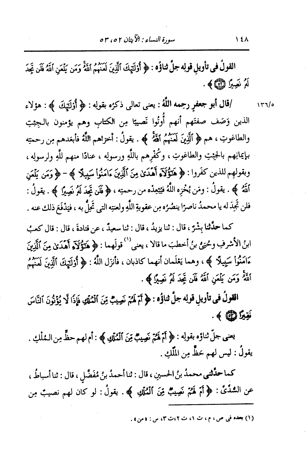 §الْقَوْلُ فِي تَأْوِيلِ قَوْلِهِ تَعَالَى: {أُولَئِكَ الَّذِينَ لَعَنَهُمُ اللَّهُ وَمَنْ يَلْعَنِ اللَّهُ فَلَنْ تَجِدَ لَهُ نَصِيرًا} [النساء: 52] يَعْنِي جَلَّ ثَنَاؤُهُ بِقَوْلِهِ {أُولَئِكَ} [البقرة: 5] هَؤُلَاءِ الَّذِينَ وَصَفَ صِفَتَهُمْ أَنَّهُمْ أُوتُوا نَصِيبًا مِنَ الْكِتَابِ وَهُمْ يُؤْمِنُونَ بِالْجِبْتِ وَالطَّاغُوتِ , هُمُ الَّذِينَ لَعَنَهُمُ اللَّهُ , يَقُولُ: أَخْزَاهُمُ اللَّهُ فَأَبْعَدَهُمْ مِنْ رَحْمَتِهِ بِإِيمَانِهِمْ بِالْجِبْتِ وَالطَّاغُوتِ وَكُفْرِهِمْ بِاللَّهِ وَرَسُولِهِ , عِنَادًا مِنْهُمْ لِلَّهِ وَلِرَسُولِهِ , وَبِقَوْلِهِمْ: {لِلَّذِينَ كَفَرُوا هَؤُلَاءِ أَهْدَى مِنَ الَّذِينَ آمَنُوا سَبِيلًا} [النساء: 51] {وَمَنْ يَلْعَنِ اللَّهُ} [النساء: 52] يَقُولُ: " وَمَنْ يُخْزِهِ اللَّهُ فَيُبْعِدَهُ مِنْ رَحْمَتِهِ {فَلَنْ تَجِدَ لَهُ نَصِيرًا} [النساء: 52] يَقُولُ: " فَلَنْ تَجِدَ لَهُ يَا مُحَمَّدُ نَاصِرًا يَنْصُرُهُ مِنْ عُقُوبَةِ اللَّهِ وَلَعْنَتِهِ الَّتِي تَحِلُّ بِهِ فَيَدْفَعُ ذَلِكَ عَنْهُ؛ كَمَا: