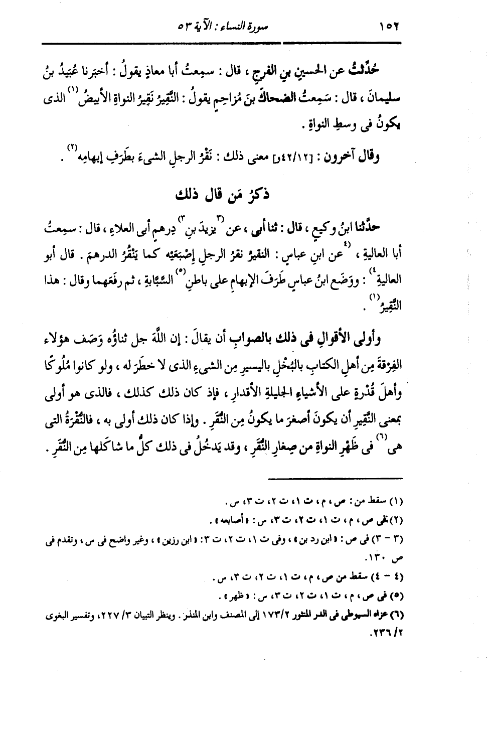 ذِكْرُ مَنْ قَالَ ذَلِكَ: حَدَّثَنَا ابْنُ وَكِيعٍ , قَالَ: ثنا أَبِي , عَنْ يَزِيدَ بْنِ دِرْهَمٍ أَبِي الْعَلَاءِ , قَالَ: سَمِعْتُ أَبَا الْعَالِيَةَ , وَوَضَعَ ابْنُ عَبَّاسٍ , §طَرَفَ الْإِبْهَامِ عَلَى ظَهْرِ السَّبَّابَةِ ثُمَّ رَفَعَهُمَا وَقَالَ: «هَذَا النَّقِيرُ» وَأَوْلَى الْأَقْوَالِ فِي ذَلِكَ بِالصَّوَابِ أَنْ يُقَالَ: إِنَّ اللَّهَ وَصَفَ هَؤُلَاءِ الْفِرْقَةَ مِنْ أَهْلِ الْكِتَابِ بِالْبُخْلِ بِالْيَسِيرِ مِنَ الشَّيْءِ الَّذِي لَا خَطَرَ لَهُ , وَلَوْ كَانُوا مُلُوكًا وَأَهْلَ قُدْرَةٍ عَلَى الْأَشْيَاءِ الْجَلِيلَةِ الْأَقْدَارِ. فَإِذْ كَانَ ذَلِكَ كَذَلِكَ , فَالَّذِي هُوَ أَوْلَى بِمَعْنَى النَّقِيرِ أَنْ يَكُونَ أَصْغَرَ مَا يَكُونُ مِنَ النَّقْرِ , وَإِذَا كَانَ ذَلِكَ أَوْلَى بِهِ , فَالنُّقْرَةُ الَّتِي فِي ظَهْرِ النَّوَاةِ مِنْ صِغَارِ النُّقَرِ , وَقَدْ يَدْخُلُ فِي ذَلِكَ كُلُّ مَا شَاكَلَهَا مِنَ النُّقَرِ.