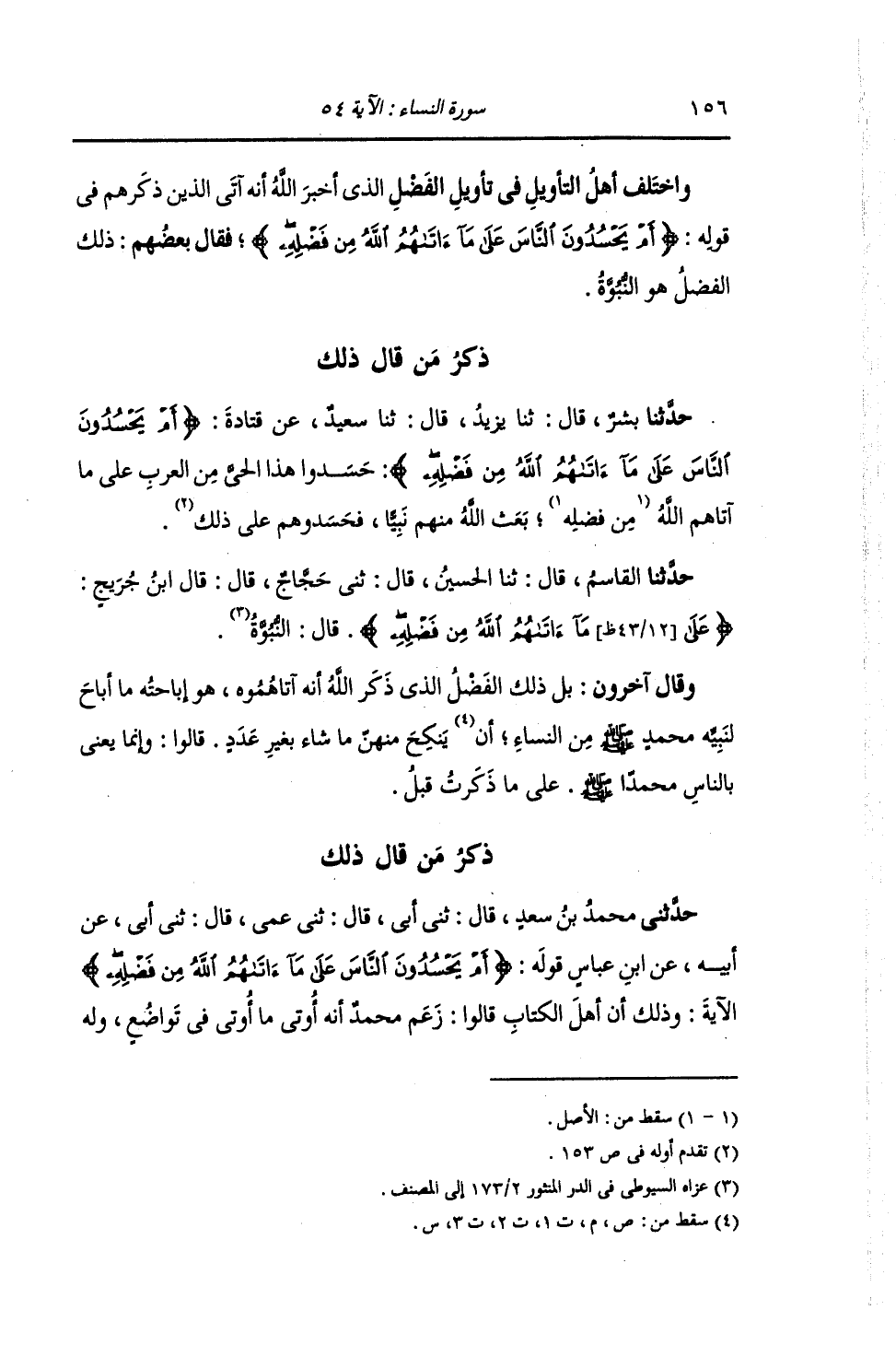 ذِكْرُ مَنْ قَالَ ذَلِكَ: حَدَّثَنَا بِشْرُ بْنُ مُعَاذٍ , قَالَ: ثنا يَزِيدُ , قَالَ: ثنا سَعِيدٌ , عَنْ قَتَادَةَ: {§أَمْ يَحْسُدُونَ النَّاسَ عَلَى مَا آتَاهُمُ اللَّهُ مِنْ فَضْلِهِ} [النساء: 54] حَسَدُوا هَذَا الْحَيَّ مِنَ الْعَرَبِ عَلَى مَا آتَاهُمُ اللَّهُ مِنْ فَضْلِهِ , بَعَثَ اللَّهُ مِنْهُمْ نَبِيًّا فَحَسَدُوهُمْ عَلَى ذَلِكَ "
