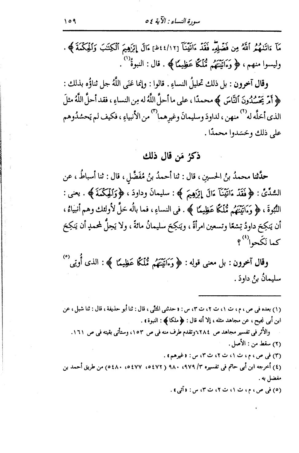 ذِكْرُ مَنْ قَالَ ذَلِكَ: حَدَّثَنَا مُحَمَّدُ بْنُ الْحُسَيْنِ , قَالَ: ثنا أَحْمَدُ بْنُ مُفَضَّلٍ , قَالَ: ثنا أَسْبَاطٌ , عَنِ السُّدِّيِّ: {§فَقَدْ آتَيْنَا آلَ إِبْرَاهِيمَ} [النساء: 54] سُلَيْمَانَ وَدَاوُدَ {الْحِكْمَةَ} [النساء: 54] يَعْنِي: " النُّبُوَّةَ. {وَآتَيْنَاهُمْ مُلْكًا عَظِيمًا} [النساء: 54] فِي النِّسَاءِ , فَمَا بَالُهُ حَلَّ لِأُولَئِكَ وَهُمْ أَنْبِيَاءُ أَنْ يَنْكِحَ دَاوُدُ تِسْعًا وَتِسْعِينَ امْرَأَةً , وَيَنْكِحَ سُلَيْمَانُ مِائَةً , وَلَا يَحِلُّ لِمُحَمَّدٍ أَنْ يَنْكِحَ كَمَا نَكَحُوا وَقَالَ آخَرُونَ: بَلْ مَعْنَى قَوْلِهِ: {وَآتَيْنَاهُمْ مُلْكًا عَظِيمًا} [النساء: 54] الَّذِي آتَى سُلَيْمَانَ بْنَ دَاوُدَ "