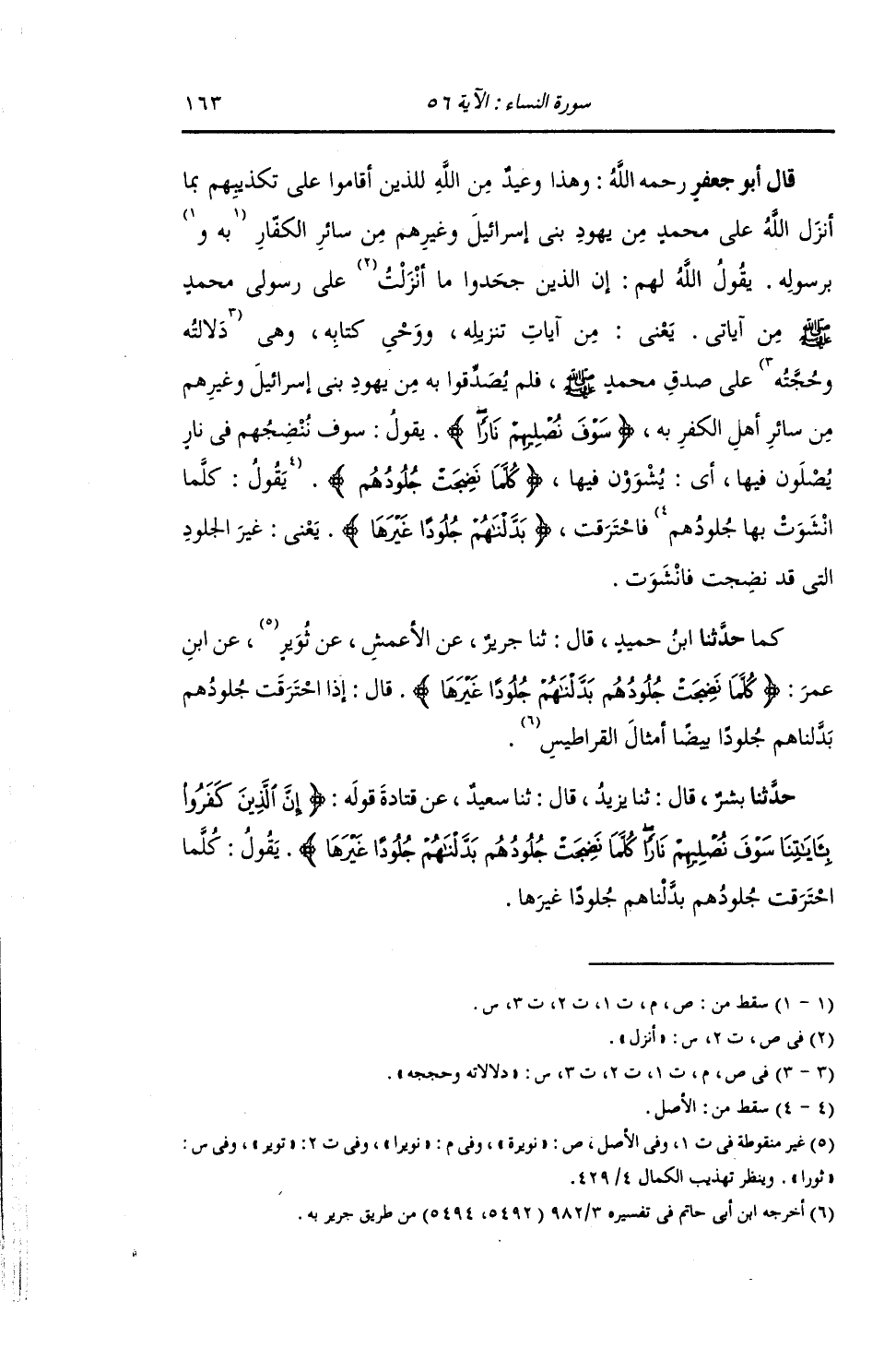 حَدَّثَنَا ابْنُ حُمَيْدٍ , قَالَ: ثنا جَرِيرٌ , عَنِ الْأَعْمَشِ , عَنْ ثُوَيْرٍ , عَنِ ابْنِ عُمَرَ: {§كُلَّمَا نَضِجَتْ جُلُودُهُمْ بَدَّلْنَاهُمْ جُلُودًا غَيْرَهَا} [النساء: 56] قَالَ: «إِذَا احْتَرَقَتْ جُلُودُهُمْ بَدَّلْنَاهُمْ جُلُودًا بِيضًا أَمْثَالَ الْقَرَاطِيسِ»