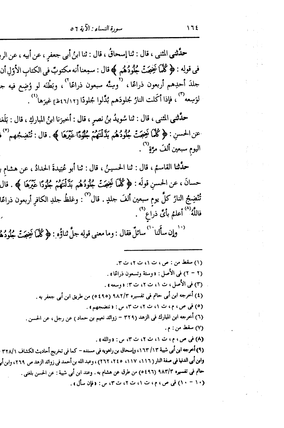 حَدَّثَنِي الْمُثَنَّى , قَالَ: ثنا سُوَيْدُ بْنُ نَصْرٍ , قَالَ: أَخْبَرَنَا ابْنُ الْمُبَارَكِ , قَالَ: بَلَغَنِي عَنِ الْحَسَنِ: {§كُلَّمَا نَضِجَتْ جُلُودُهُمْ بَدَّلْنَاهُمْ جُلُودًا غَيْرَهَا} [النساء: 56] قَالَ: «نُنْضِجُهُمْ فِي الْيَوْمِ سَبْعِينَ أَلْفَ مَرَّةِ»