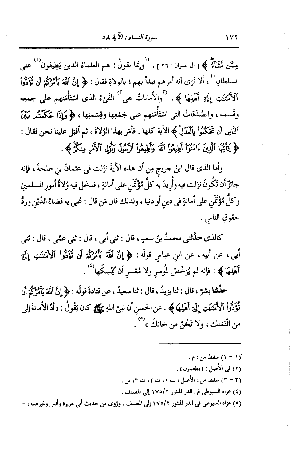 مِمَّنْ تَشَاءُ} [آل عمران: 26] أَلَا تَرَى أَنَّهُ أَمَرَ فَقَالَ: {إِنَّ اللَّهَ يَأْمُرُكُمْ أَنْ تُؤَدُّوا الْأَمَانَاتِ إِلَى أَهْلِهَا} [النساء: 58] وَالْأَمَانَاتُ: هِيَ الْفَيْءُ الَّذِي اسْتَأْمَنَهُمْ عَلَى جَمْعِهِ وَقَسْمِهِ , وَالصَّدَقَاتُ الَّتِي اسْتَأْمَنَهُمْ عَلَى جَمْعِهَا وَقَسْمِهَا. {وَإِذَا حَكَمْتُمْ بَيْنَ النَّاسِ أَنْ تَحْكُمُوا بِالْعَدْلِ} [النساء: 58] الْآيَةُ كُلُّهَا فَأَمَرَ بِهَذَا الْوُلَاةَ , ثُمَّ أَقْبَلَ عَلَيْنَا نَحْنُ , فَقَالَ: {يَا أَيُّهَا الَّذِينَ آمَنُوا أَطِيعُوا اللَّهَ وَأَطِيعُوا الرَّسُولَ وَأُولِي الْأَمْرِ مِنْكُمْ} [النساء: 59] " وَأَمَّا الَّذِي قَالَ ابْنُ جُرَيْجٍ مِنْ أَنَّ هَذِهِ الْآيَةَ نَزَلَتْ فِي عُثْمَانَ بْنِ طَلْحَةَ فَإِنَّهُ جَائِزٌ أَنْ تَكُونَ نَزَلَتْ فِيهِ , وَأُرِيدَ بِهِ كُلُّ مُؤْتَمَنٍ عَلَى أَمَانَةٍ فَدَخَلَ فِيهِ وُلَاةُ أُمُورِ الْمُسْلِمِينَ وَكُلُّ مُؤْتَمَنٍ عَلَى أَمَانَةٍ فِي دِينٍ أَوْ دُنْيَا , وَلِذَلِكَ قَالَ مَنْ قَالَ: عُنِيَ بِهِ قَضَاءُ الدَّيْنِ وَرَدُّ حُقُوقِ النَّاسِ , كَالَّذِي: