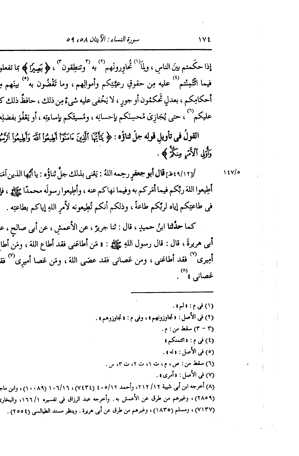 حَدَّثَنَا ابْنُ حُمَيْدٍ , قَالَ: ثنا جَرِيرٌ , عَنِ الْأَعْمَشِ , عَنْ أَبِي صَالِحٍ , عَنْ أَبِي هُرَيْرَةَ , قَالَ: قَالَ رَسُولُ اللَّهِ صَلَّى اللهُ عَلَيْهِ وَسَلَّمَ: «§مَنْ أَطَاعَنِي فَقَدْ أَطَاعَ اللَّهَ وَمَنْ أَطَاعَ أَمِيرِي فَقَدْ أَطَاعَنِي , وَمَنْ عَصَانِي فَقَدْ عَصَى اللَّهَ وَمَنْ عَصَا أَمِيرِي فَقَدْ عَصَانِي» -[175]- وَاخْتَلَفَ أَهْلُ التَّأْوِيلِ فِي مَعْنَى قَوْلِهِ: {أَطِيعُوا اللَّهَ وَأَطِيعُوا الرَّسُولَ} [النساء: 59] فَقَالَ بَعْضُهُمْ: ذَلِكَ أَمْرٌ مِنَ اللَّهِ بِاتِّبَاعِ سُنَّتِهِ