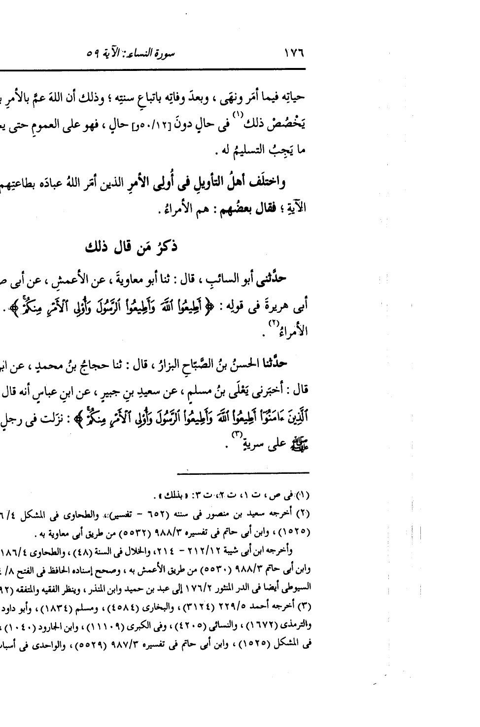 ذِكْرُ مَنْ قَالَ ذَلِكَ: حَدَّثَنِي أَبُو السَّائِبِ سَلْمُ بْنُ جُنَادَةَ قَالَ: ثنا أَبُو مُعَاوِيَةَ , عَنِ الْأَعْمَشِ , عَنْ أَبِي صَالِحٍ , عَنْ أَبِي هُرَيْرَةَ , فِي قَوْلِهِ: {§أَطِيعُوا اللَّهَ وَأَطِيعُوا الرَّسُولَ وَأُولِي الْأَمْرِ مِنْكُمْ} [النساء: 59] قَالَ: «هُمُ الْأَمَرَاءُ»