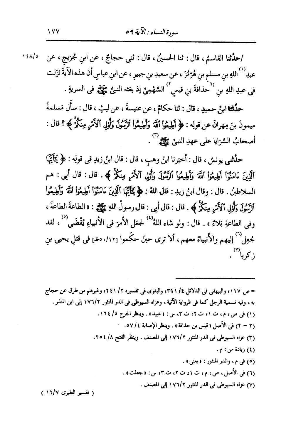 حَدَّثَنَا الْقَاسِمُ قَالَ: ثنا الْحُسَيْنُ قَالَ: ثني حَجَّاجٌ , عَنِ ابْنِ جُرَيْجٍ , عَنْ عُبَيْدِ اللَّهِ بْنِ مُسْلِمِ بْنِ هُرْمُزَ , عَنْ سَعِيدِ بْنِ جُبَيْرٍ , عَنِ ابْنِ عَبَّاسٍ: أَنَّ هَذِهِ الْآيَةَ §نَزَلَتْ فِي عَبْدِ اللَّهِ بْنِ حُذَافَةَ بْنِ قَيْسٍ السَّهْمِيِّ إِذْ بَعَثَهُ النَّبِيُّ صَلَّى اللهُ عَلَيْهِ وَسَلَّمَ فِي السَّرِيَّةِ "