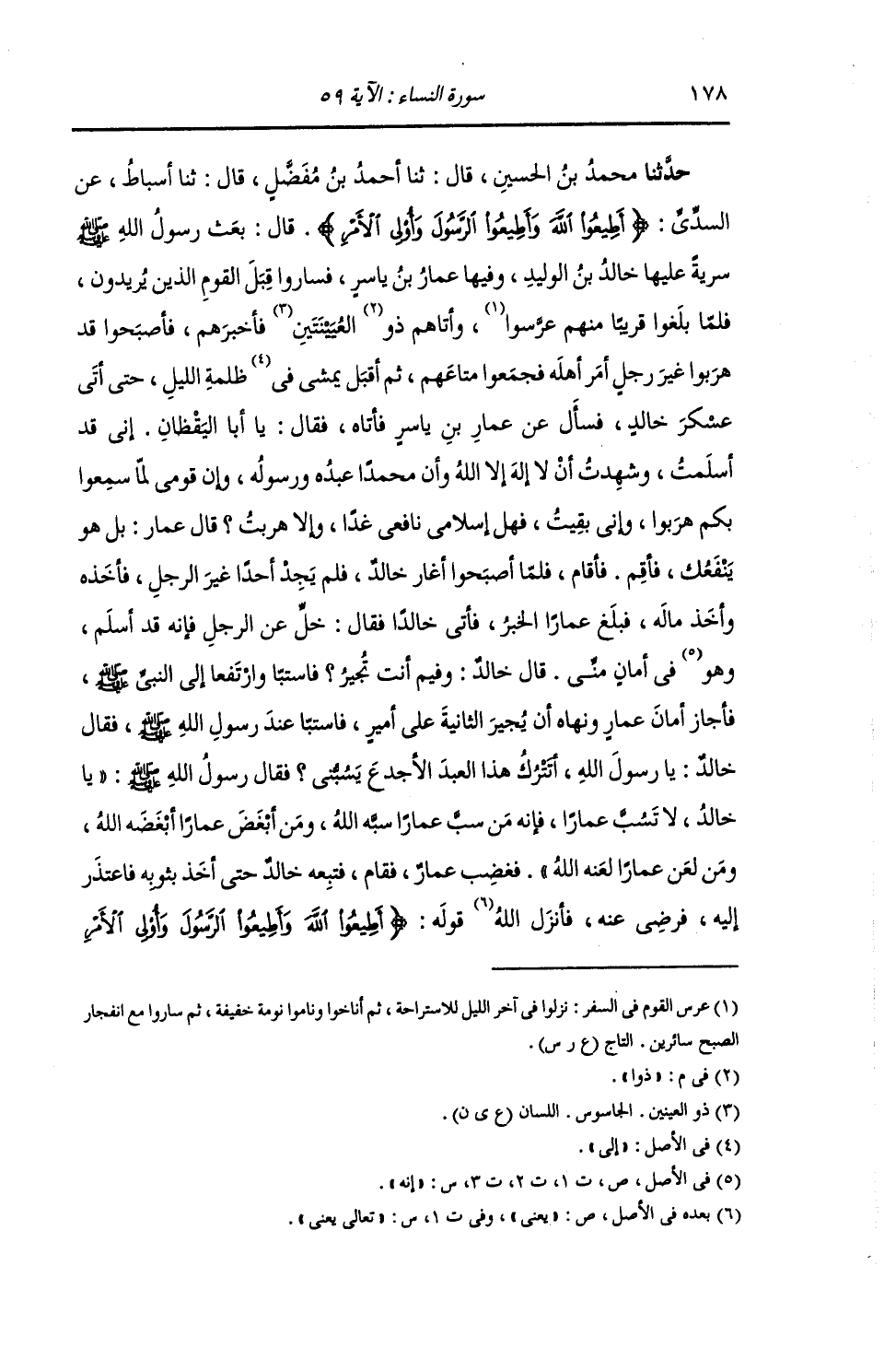 حَدَّثَنَا مُحَمَّدُ بْنُ الْحُسَيْنِ , قَالَ: ثنا أَحْمَدُ بْنُ مُفَضَّلٍ , ثنا أَسْبَاطٌ , عَنِ السُّدِّيِّ: {§أَطِيعُوا اللَّهَ وَأَطِيعُوا الرَّسُولَ وَأُولِي الْأَمْرِ مِنْكُمْ} [النساء: 59] قَالَ: " بَعَثَ رَسُولُ اللَّهِ صَلَّى اللهُ عَلَيْهِ وَسَلَّمَ سَرِيَّةً عَلَيْهَا خَالِدُ بْنُ الْوَلِيدِ , وَفِيهَا عَمَّارُ بْنُ يَاسِرٍ , فَسَارُوا قِبَلَ الْقَوْمِ الَّذِينَ يُرِيدُونَ , فَلَمَّا بَلَغُوا قَرِيبًا مِنْهُمْ عَرَّسُوا , وَأَتَاهُمْ ذُو الْعُيَيْنَتَيْنِ , فَأَخْبَرَهُمْ فَأَصْبَحُوا وَقَدْ هَرَبُوا غَيْرَ رَجُلٍ أَمَرَ أَهْلَهُ , فَجَمَعُوا مَتَاعَهُمْ. ثُمَّ أَقْبَلَ يَمْشِي فِي ظُلْمَةِ اللَّيْلِ , حَتَّى أَتَى عَسْكَرَ خَالِدٍ , فَسَأَلَ عَنْ عَمَّارِ بْنِ يَاسِرِ فَأَتَاهُ , فَقَالَ: يَا أَبَا الْيَقْظَانِ , إِنِّي قَدْ أَسْلَمْتُ وَشَهِدْتُ أَنْ لَا إِلَهَ إِلَّا اللَّهُ وَأَنَّ مُحَمَّدًا عَبْدُهُ وَرَسُولُهُ , وَإِنَّ قَوْمِي لَمَّا سَمِعُوا بِكُمْ هَرَبُوا , وَإِنِّي بَقِيتُ فَهَلْ إِسْلَامِي نَافِعِي غَدًا وَإِلَّا هَرَبْتُ؟ قَالَ عَمَّارٌ: بَلْ هُوَ يَنْفَعُكَ فَأَقِمْ. فأَقَامَ , فَلَمَّا أَصْبَحُوا أَغَارَ خَالِدٌ , فَلَمْ يَجِدْ أَحَدًا غَيْرَ الرَّجُلِ , فَأَخَذَهُ وَأَخَذَ مَالَهُ , فَبَلَغَ عَمَّارًا الْخَبَرُ , فَأَتَى خَالِدًا فَقَالَ: خَلِّ عَنِ الرَّجُلِ فَإِنَّهُ قَدْ أَسْلَمَ , وَهُوَ فِي أَمَانٍ مِنِّي. فَقَالَ خَالِدٌ: وَفِيمَ أَنْتَ تُجِيرُ؟ فَاسْتَبَّا وَارْتَفَعَا إِلَى النَّبِيِّ صَلَّى اللهُ عَلَيْهِ وَسَلَّمَ , فَأَجَازَ أَمَانَ عَمَّارٍ وَنَهَاهُ أَنْ يُجِيرَ الثَّانِيَةَ عَلَى أَمِيرٍ. فَاسْتَبَّا عِنْدَ رَسُولِ اللَّهِ صَلَّى اللهُ عَلَيْهِ وَسَلَّمَ , فَقَالَ خَالِدٌ: يَا رَسُولَ اللَّهِ أَتَتْرُكُ هَذَا الْعَبْدَ الْأَجْدَعَ يَسُبُّنِي؟ فَقَالَ رَسُولُ اللَّهِ صَلَّى اللهُ عَلَيْهِ وَسَلَّمَ: «يَا خَالِدُ لَا تَسُبَّ عَمَّارًا , فَإِنَّهُ مَنْ سَبَّ عَمَّارًا سَبَّهُ اللَّهُ , وَمَنْ أَبْغَضَ عَمَّارًا أَبْغَضَهُ اللَّهُ , وَمَنْ لَعَنَ عَمَّارًا لَعَنَهُ اللَّهُ» . فغَضِبَ عَمَّارٌ , فَقَامَ فَتَبِعَهُ خَالِدٌ حَتَّى أَخَذَ بِثَوْبِهِ فَاعْتَذَرَ إِلَيْهِ , فَرَضِيَ عَنْهُ , فَأَنْزَلَ اللَّهُ تَعَالَى قَوْلُهُ: {أَطِيعُوا اللَّهَ وَأَطِيعُوا الرَّسُولَ وَأُولِي الْأَمْرِ -[179]- مِنْكُمْ} [النساء: 59] وَقَالَ آخَرُونَ: هُمْ أَهْلُ الْعِلْمِ وَالْفِقْهِ