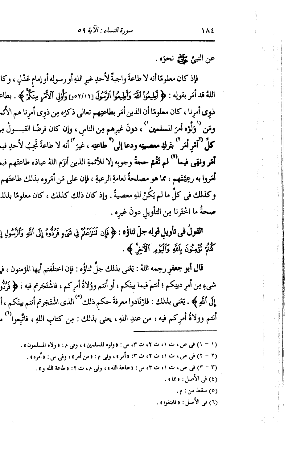 §الْقَوْلُ فِي تَأْوِيلِ قَوْلِهِ تَعَالَى: {فَإِنْ تَنَازَعْتُمْ فِي شَيْءٍ فَرُدُّوهُ إِلَى اللَّهِ وَالرَّسُولِ إِنْ كُنْتُمْ تُؤْمِنُونَ بِاللَّهِ وَالْيَوْمِ الْآخِرِ} [النساء: 59] يَعْنِي بِذَلِكَ جَلَّ ثَنَاؤُهُ: فَإِنِ اخْتَلَفْتُمْ أَيُّهَا الْمُؤْمِنُونَ فِي شَيْءٍ مِنْ أَمْرِ دِينِكُمْ أَنْتُمْ فِيمَا بَيْنَكُمْ أَوْ أَنْتُمْ وَوُلَاةُ أَمْرِكُمْ فَاشْتَجَرْتُمْ فِيهِ {فَرُدُّوهُ إِلَى اللَّهِ} [النساء: 59] يَعْنِي بِذَلِكَ: فَارْتَادُوا مَعْرِفَةَ حُكْمِ الَّذِي اشْتَجَرْتُمْ أَنْتُمْ بَيْنَكُمْ أَوْ أَنْتُمْ وَأُولُو أَمْرِكُمْ مِنْ عِنْدِ اللَّهِ , يَعْنِي بِذَلِكَ: مِنْ كِتَابِ اللَّهِ , فَاتَّبِعُوا