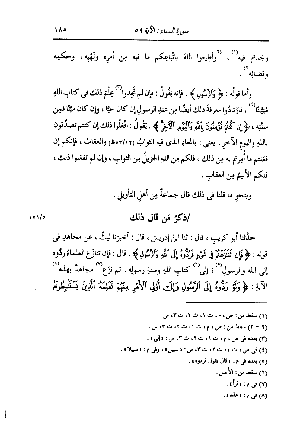 ذِكْرُ مَنْ قَالَ ذَلِكَ: حَدَّثَنَا أَبُو كُرَيْبٍ , قَالَ: ثنا ابْنُ إِدْرِيسَ , قَالَ: أَخْبَرَنَا لَيْثٌ , عَنْ مُجَاهِدٍ , فِي قَوْلِهِ: {§فَإِنْ تَنَازَعْتُمْ فِي شَيْءٍ فَرُدُّوهُ إِلَى اللَّهِ وَالرَّسُولِ} [النساء: 59] قَالَ: " فَإِنْ تَنَازَعَ الْعُلَمَاءُ رَدُّوهُ إِلَى اللَّهِ وَالرَّسُولِ. قَالَ: يَقُولُ: فَرُدُّوهُ إِلَى كِتَابِ اللَّهِ وَسُنَّةِ رَسُولِهِ. ثُمَّ قَرَأَ مُجَاهِدٌ هَذِهِ الْآيَةَ: {وَلَوْ رَدُّوهُ إِلَى الرَّسُولِ وَإِلَى أُولِي الْأَمْرِ مِنْهُمْ لَعَلِمَهُ الَّذِينَ يَسْتَنْبِطُونَهُ -[186]- مِنْهُمْ} [النساء: 83] "