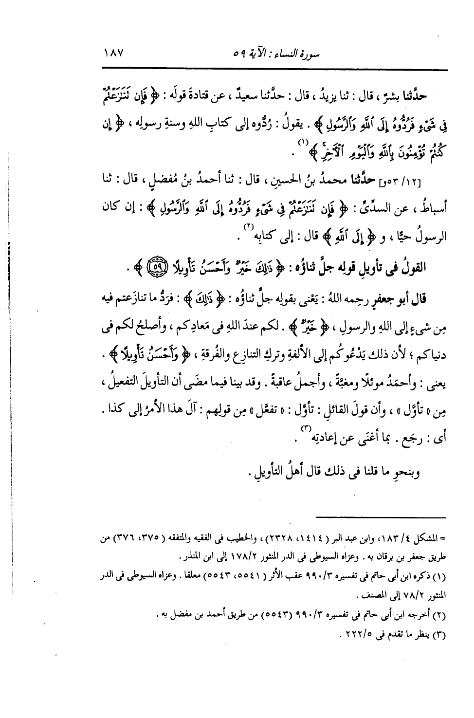 §الْقَوْلُ فِي تَأْوِيلِ قَوْلِهِ تَعَالَى: {ذَلِكَ خَيْرٌ وَأَحْسَنُ تَأْوِيلًا} [النساء: 59] يَعْنِي بِقَوْلِهِ جَلَّ ثَنَاؤُهُ: {ذَلِكَ} [البقرة: 2] فَرَدُّ مَا تَنَازَعْتُمْ فِيهِ مِنْ شَيْءٍ إِلَى اللَّهِ وَالرَّسُولِ , خَيْرٌ لَكُمْ عِنْدَ اللَّهِ فِي مَعَادِكُمْ , وَأَصْلَحُ لَكُمْ فِي دُنْيَاكُمْ , لِأَنَّ ذَلِكَ يَدْعُوكُمْ إِلَى الْأُلْفَةِ , وَتَرْكِ التَّنَازُعِ وَالْفُرْقَةِ. {وَأَحْسَنُ تَأْوِيلًا} [النساء: 59] يَعْنِي: " وَأَحْمَدُ مَوْئِلًا وَمَغَبَّةً , وَأَجْمَلُ عَاقِبَةً. وَقَدْ بَيَّنَّا فِيمَا مَضَى أَنَّ التَّأْوِيلَ: التَّفْعِيلُ مِنْ تَأَوَّلَ , وَأَنَّ قَوْلَ الْقَائِلِ تَأَوَّلَ: تَفَعَّلَ , مِنْ قَوْلِهِمْ آلَ هَذَا الْأَمْرُ إِلَى كَذَا: أَيْ رَجَعَ؛ بِمَا أَغْنَى عَنْ إِعَادَتِهِ وَبِنَحْوِ مَا قُلْنَا فِي ذَلِكَ قَالَ أَهْلُ التَّأْوِيلِ