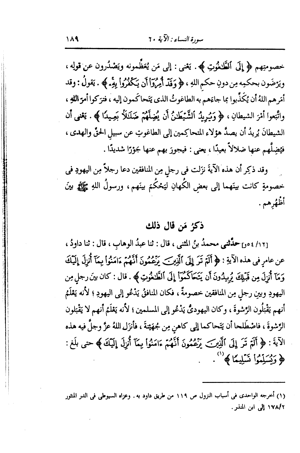 ذِكْرُ مَنْ قَالَ ذَلِكَ: حَدَّثَنِي مُحَمَّدُ بْنُ الْمُثَنَّى , قَالَ: ثنا عَبْدُ الْوَهَّابِ , قَالَ: ثنا دَاوُدُ , عَنْ عَامِرٍ , فِي هَذِهِ الْآيَةِ: {§أَلَمْ تَرَ إِلَى الَّذِينَ يَزْعُمُونَ أَنَّهُمْ آمَنُوا بِمَا أُنْزِلَ إِلَيْكَ وَمَا أُنْزِلَ مِنْ قَبْلِكَ يُرِيدُونَ أَنْ يَتَحَاكَمُوا إِلَى الطَّاغُوتِ} [النساء: 60] قَالَ: " كَانَ بَيْنَ رَجُلٍ مِنَ الْيَهُودِ وَرَجُلٍ مِنَ الْمُنَافِقِينَ خُصُومَةٌ , فَكَانَ الْمُنَافِقُ يَدْعُو إِلَى الْيَهُودِ لِأَنَّهُ يَعْلَمُ أَنَّهُمْ يَقْبَلُونَ الرِّشْوَةَ , وَكَانَ الْيَهُودِيُّ يَدْعُو إِلَى الْمُسْلِمِينَ لِأَنَّهُ يَعْلَمُ أَنَّهُمْ لَا يَقْبَلُونَ الرِّشْوَةَ , فَاصْطَلَحَا أَنْ يَتَحَاكَمَا إِلَى كَاهِنٍ مِنْ جُهَيْنَةَ , فَأَنْزَلَ اللَّهُ فِيهِ هَذِهِ الْآيَةَ: {أَلَمْ تَرَ إِلَى الَّذِينَ يَزْعُمُونَ أَنَّهُمْ آمَنُوا بِمَا أُنْزِلَ إِلَيْكَ} [النساء: 60] حَتَّى بَلَغَ: {وَيُسَلِّمُوا تَسْلِيمًا} [النساء: 65] "