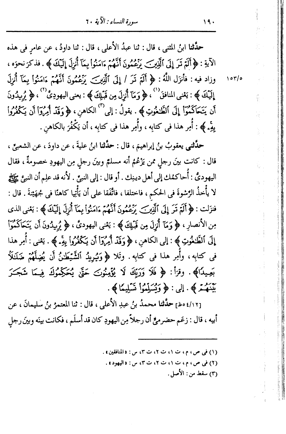 حَدَّثَنِي يَعْقُوبُ بْنُ إِبْرَاهِيمَ قَالَ: حَدَّثَنَا ابْنُ عُلَيَّةَ , عَنْ دَاوُدَ , عَنِ الشَّعْبِيِّ قَالَ: كَانَتْ بَيْنَ رَجُلٍ مِمَّنْ يَزْعُمُ أَنَّهُ مُسْلِمٌ , وَبَيْنَ رَجُلٍ مِنَ الْيَهُودِ خُصُومَةٌ , فَقَالَ الْيَهُودِيُّ: أُحَاكِمُكَ إِلَى أَهْلِ دِينِكَ , أَوْ قَالَ: إِلَى النَّبِيِّ؛ لِأَنَّهُ قَدْ عَلِمَ أَنَّ رَسُولَ اللَّهِ صَلَّى اللهُ عَلَيْهِ وَسَلَّمَ لَا يَأْخُذُ الرِّشْوَةَ فِي الْحُكْمِ. فَاخْتَلَفَا , فَاتَّفَقَا عَلَى أَنْ يَأْتِيَا كَاهِنًا فِي جُهَيْنَةَ قَالَ: فَنَزَلَتْ: {§أَلَمْ تَرَ إِلَى الَّذِينَ يَزْعُمُونَ أَنَّهُمْ آمَنُوا بِمَا أُنْزِلَ إِلَيْكَ} [النساء: 60] يَعْنِي: " الَّذِي مِنَ الْأَنْصَارِ {وَمَا أُنْزِلَ مِنْ قَبْلِكَ} [البقرة: 4] يَعْنِي: " الْيَهُودِيَّ {يُرِيدُونَ أَنْ يَتَحَاكَمُوا إِلَى الطَّاغُوتِ} [النساء: 60] إِلَى الْكَاهِنِ {وَقَدْ أُمِرُوا أَنْ يَكْفُرُوا بِهِ} [النساء: 60] يَعْنِي: " أَمَرَ هَذَا فِي كِتَابِهِ , وَأَمَرَ هَذَا فِي كِتَابِهِ. وَتَلَا: {وَيُرِيدُ الشَّيْطَانُ أَنْ يُضِلَّهُمْ ضَلَالًا بَعِيدًا} [النساء: 60] , وَقَرَأَ: {فَلَا وَرَبِّكَ لَا يُؤْمِنُونَ حَتَّى يُحَكِّمُوكَ فِيمَا شَجَرَ بَيْنَهُمْ} [النساء: 65] إِلَى: {وَيُسَلِّمُوا تَسْلِيمًا} [النساء: 65] "