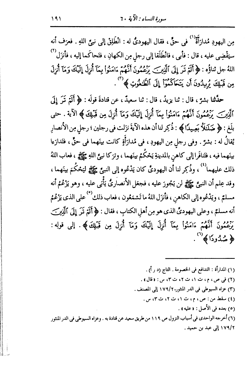 حَدَّثَنَا بِشْرُ بْنُ مُعَاذٍ , قَالَ: ثنا يَزِيدُ , قَالَ: ثنا سَعِيدٌ , عَنْ قَتَادَةَ , قَوْلُهُ: {أَلَمْ تَرَ إِلَى الَّذِينَ يَزْعُمُونَ أَنَّهُمْ آمَنُوا بِمَا أُنْزِلَ إِلَيْكَ وَمَا أُنْزِلَ مِنْ قَبْلِكَ} [النساء: 60] الْآيَةُ , حَتَّى بَلَغَ: {ضَلَالًا بَعِيدًا} [النساء: 60] ذُكِرَ لَنَا أَنَّ هَذِهِ الْآيَةَ نَزَلَتْ فِي رَجُلَيْنِ: رَجُلٍ مِنَ الْأَنْصَارِ يُقَالَ لَهُ بِشْرٌ , وَفِي رَجُلٍ مِنَ الْيَهُودِ فِي مُدَارَأَةٍ كَانَتْ بَيْنَهُمَا فِي حَقٍّ , فَتَدَارَءَا بَيْنَهُمَا فِيهِ , فَتَنَافَرَا إِلَى كَاهِنٍ بِالْمَدِينَةِ يَحْكُمُ بَيْنَهُمَا , وَتَرَكَا نَبِيَّ اللَّهِ صَلَّى اللهُ عَلَيْهِ وَسَلَّمَ. فَعَابَ اللَّهُ عَزَّ وَجَلَّ ذَلِكَ. وذُكِرَ لَنَا أَنَّ الْيَهُودِيَّ كَانَ يَدْعُوهُ إِلَى النَّبِيِّ صَلَّى اللهُ عَلَيْهِ وَسَلَّمَ لِيَحْكُمَ بَيْنَهُمَا , وَقَدْ عَلِمَ أَنَّ نَبِيَّ اللَّهِ صَلَّى اللهُ عَلَيْهِ وَسَلَّمَ لَنْ يَجُورَ عَلَيْهِ , فَجَعَلَ الْأَنْصَارِيُّ يَأْبَى عَلَيْهِ وَهُوَ يَزْعُمُ أَنَّهُ مُسْلِمٌ وَيَدْعُوهُ إِلَى الْكَاهِنِ , فَأَنْزَلَ اللَّهُ تَبَارَكَ وَتَعَالَى مَا تَسْمَعُونَ , فَعَابَ ذَلِكَ عَلَى الَّذِي زَعَمَ أَنَّهُ مُسْلِمٌ , وَعَلَى الْيَهُودِيِّ الَّذِي هُوَ مِنْ أَهْلِ الْكِتَابِ , فَقَالَ: {§أَلَمْ تَرَ إِلَى الَّذِينَ يَزْعُمُونَ أَنَّهُمْ آمَنُوا بِمَا أُنْزِلَ إِلَيْكَ} [النساء: 60] إِلَى قَوْلِهِ: {صُدُودًا} [النساء: 61] "