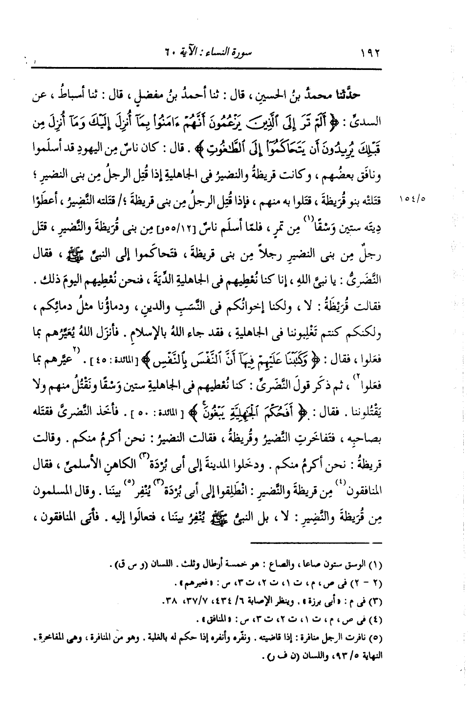 حَدَّثَنَا مُحَمَّدُ بْنُ الْحُسَيْنِ , قَالَ: ثنا أَحْمَدُ بْنُ مُفَضَّلٍ , قَالَ: ثنا أَسْبَاطٌ , عَنِ السُّدِّيِّ: {§أَلَمْ تَرَ إِلَى الَّذِينَ يَزْعُمُونَ أَنَّهُمْ آمَنُوا بِمَا أُنْزِلَ إِلَيْكَ وَمَا أُنْزِلَ مِنْ قَبْلِكَ يُرِيدُونَ أَنْ يَتَحَاكَمُوا إِلَى الطَّاغُوتِ} [النساء: 60] قَالَ: " كَانَ نَاسٌ مِنَ الْيَهُودِ قَدْ أَسْلَمُوا وَنَافَقَ بَعْضُهُمْ , وَكَانَتْ قُرَيْظَةُ وَالنَّضِيرُ فِي الْجَاهِلِيَّةِ إِذَا قُتِلَ الرَّجُلُ مِنْ بَنِي النَّضِيرِ قَتَلَتْهُ بَنُو قُرَيْظَةَ قَتَلُوا بِهِ مِنْهُمْ , فَإِذَا قُتِلَ الرَّجُلُ مِنْ بَنِي قُرَيْظَةَ قَتَلَتْهُ النَّضِيرُ , أَعْطُوْا دِيَتَهُ سِتِّينَ وَسَقًا مِنْ تَمْرٍ. فَلَمَّا أَسْلَمَ نَاسٌ مِنْ بَنِي قُرَيْظَةَ وَالنَّضِيرِ , قَتَلَ رَجُلٌ مِنْ بَنِي النَّضِيرِ رَجُلًا مِنْ بَنِي قُرَيْظَةَ , فَتَحَاكَمُوا إِلَى النَّبِيِّ صَلَّى اللهُ عَلَيْهِ وَسَلَّمَ , فَقَالَ النَّضِيرِيُّ: يَا رَسُولَ اللَّهِ , إِنَّا كُنَّا نُعْطِيهِمْ فِي الْجَاهِلِيَّةِ الدِّيَةَ , فَنَحْنُ نُعْطِيهِمُ الْيَوْمَ ذَلِكَ. فَقَالَتْ قُرَيْظَةُ: لَا , وَلَكِنَّا إِخْوَانُكُمْ فِي النَّسَبِ وَالدِّينِ , وَدِمَاؤُنَا مِثْلُ دِمَائِكُمْ , وَلَكِنَّكُمْ كُنْتُمْ تَغْلِبُونَنَا فِي الْجَاهِلِيَّةِ , فَقَدْ جَاءَ اللَّهُ بِالْإِسْلَامِ فَأَنْزَلَ اللَّهُ يُعَيِّرُهُمْ بِمَا فَعَلُوا. فَقَالَ: {وَكَتَبْنَا عَلَيْهِمْ فِيهَا أَنَّ النَّفْسَ بِالنَّفْسِ} [المائدة: 45] فَعَيَّرَهُمْ , ثُمَّ ذَكَرَ قَوْلَ النَّضِيرِيِّ: كُنَّا نُعْطِيهِمْ فِي الْجَاهِلِيَّةِ سِتِّينَ وَسَقًا وَنَقْتُلُ مِنْهُمْ وَلَا يَقْتُلُونَ , فَقَالَ: {أَفَحُكْمَ الْجَاهِلِيَّةِ يَبْغُونَ} [المائدة: 50] وَأَخَذَ النَّضِيرِيَّ فَقَتَلَهُ بِصَاحِبِهِ. فتَفَاخَرَتِ النَّضِيرُ وَقُرَيْظَةُ , فَقَالَتِ النَّضِيرُ: نَحْنُ أَكْرَمُ مِنْكُمْ , وَقَالَتْ قُرَيْظَةُ: نَحْنُ أَكْرَمُ مِنْكُمْ , وَدَخَلُوا الْمَدِينَةَ إِلَى أَبِي بَرْزَةَ الْكَاهِنِ الْأَسْلَمِيِّ , فَقَالَ الْمُنَافِقُ مِنْ قُرَيْظَةَ وَالنَّضِيرِ: انْطَلِقُوا إِلَى أَبِي بَرْزَةَ يُنَفِّرُ بَيْنَنَا. وَقَالَ الْمُسْلِمُونَ مِنْ قُرَيْظَةَ وَالنَّضِيرِ: لَا , بَلِ النَّبِيِّ صَلَّى اللهُ عَلَيْهِ وَسَلَّمَ يُنَفِّرُ بَيْنَنَا , فَتَعَالَوْا إِلَيْهِ. فَأَبَى الْمُنَافِقُونِ , -[193]- وَانْطَلَقُوا إِلَى أَبِي بَرْزَةَ فَسَأَلُوهُ , فَقَالَ: أَعْظِمُوا اللُّقْمَةَ. يَقُولُ: أَعْظِمُوا الْخَطَرَ. فَقَالُوا: لَكَ عَشَرَةُ أَوْسَاقٍ قَالَ: لَا , بَلْ مِائَةُ وَسَقٍ دِيَتِي , فَإِنِّي أَخَافُ أَنْ أُنَفِّرَ النَّضِيرَ فَتَقْتُلَنِي قُرَيْظَةُ , أَوْ أُنَفِّرَ قُرَيْظَةَ فَتَقْتُلَنِي النَّضِيرُ فَأَبَوْا أَنْ يُعْطُوهُ فَوْقَ عَشَرَةِ أَوْسَاقٍ , وَأَبَى أَنْ يَحْكُمَ بَيْنَهُمْ , فَأَنْزَلَ اللَّهُ عَزَّ وَجَلَّ: {يُرِيدُونَ أَنْ يَتَحَاكَمُوا إِلَى الطَّاغُوتِ} [النساء: 60] وَهُوَ أَبُو بَرْزَةَ , وَقَدْ أُمِرُوا أَنْ يَكْفُرُوا بِهِ , إِلَى قَوْلِهِ: {وَيُسَلِّمُوا تَسْلِيمًا} [النساء: 65] وَقَالَ آخَرُونَ: الطَّاغُوتُ فِي هَذَا الْمَوْضِعِ: هُوَ كَعْبُ بْنُ الْأَشْرَفِ
