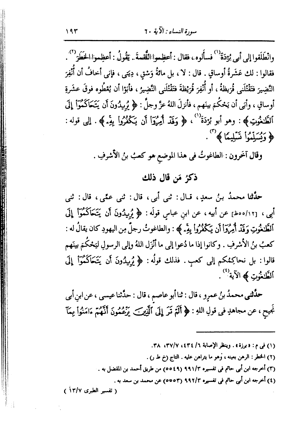ذِكْرُ مَنْ قَالَ ذَلِكَ: حَدَّثَنِي مُحَمَّدُ بْنُ سَعْدٍ , قَالَ: ثني أَبِي قَالَ: ثني عَمِّي قَالَ: ثني أَبِي عَنْ أَبِيهِ , عَنِ ابْنِ عَبَّاسٍ , قَوْلُهُ: {§يُرِيدُونَ أَنْ يَتَحَاكَمُوا , إِلَى الطَّاغُوتِ وَقَدْ أُمِرُوا أَنْ يَكْفُرُوا بِهِ} [النساء: 60] وَالطَّاغُوتُ: رَجُلٌ مِنَ الْيَهُودِ كَانَ يُقَالَ لَهُ كَعْبُ بْنُ الْأَشْرَفِ , وَكَانُوا إِذَا مَا دُعُوا إِلَى مَا أَنْزَلَ اللَّهُ وَإِلَى الرَّسُولِ لِيَحْكُمَ بَيْنَهُمْ قَالُوا: بَلْ نُحَاكِمُكُمْ إِلَى كَعْبٍ؛ فَذَلِكَ قَوْلُهُ: {يُرِيدُونَ أَنْ يَتَحَاكَمُوا إِلَى الطَّاغُوتِ} [النساء: 60] الْآيَةُ "