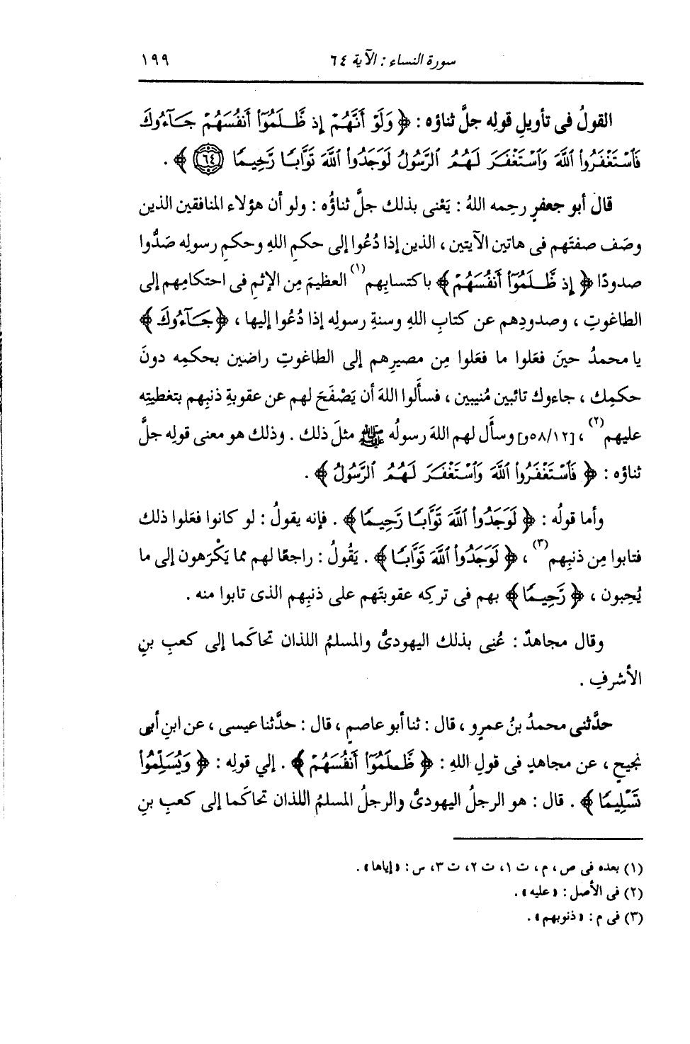 §الْقَوْلُ فِي تَأْوِيلِ قَوْلِهِ تَعَالَى: {وَلَوْ أَنَّهُمْ إِذْ ظَلَمُوا أَنْفُسَهُمْ جَاءُوكَ فَاسْتَغْفَرُوا اللَّهَ وَاسْتَغْفَرَ لَهُمُ الرَّسُولَ لَوَجَدُوا اللَّهَ تَوَّابًا رَحِيمًا} يَعْنِي بِذَلِكَ جَلَّ ثَنَاؤُهُ: وَلَوْ أَنَّ هَؤُلَاءِ الْمُنَافِقِينَ الَّذِينَ وَصَفَ صِفَتَهُمْ فِي هَاتَيْنِ الْآيَتَيْنِ , الَّذِينَ إِذَا دُعُوا إِلَى حُكْمِ اللَّهِ وَحُكْمِ رَسُولِهِ صَدُّوا صُدُودًا , إِذْ ظَلَمُوا أَنْفُسَهُمْ بِاكْتِسَابِهِمْ إِيَّاهَا الْعَظِيمَ مِنَ الْإِثْمِ فِي احْتِكَامِهِمْ إِلَى الطَّاغُوتِ وَصُدُودِهِمْ عَنْ كِتَابِ اللَّهِ وَسُنَّةِ رَسُولِهِ , إِذَا دُعُوا إِلَيْهَا جَاءُوكَ يَا مُحَمَّدُ حِينَ فَعَلُو مَا فَعَلُوا مِنْ مَصِيرِهِمْ إِلَى الطَّاغُوتِ رَاضِينَ بِحُكْمِهِ دُونَ حُكْمِكَ , جَاءُوكَ تَائِبِينَ مُنِيبِينَ , فَسَأَلُوا اللَّهَ أَنْ يَصْفَحَ لَهُمْ عَنْ عُقُوبَةِ ذَنْبِهِمْ بِتَغْطِيَتِهِ عَلَيْهِمْ , وَسَأَلَ لَهُمُ اللَّهَ رَسُولُهُ صَلَّى اللهُ عَلَيْهِ وَسَلَّمَ مِثْلَ ذَلِكَ. وَذَلِكَ هُوَ مَعْنَى قَوْلِهِ: {فَاسْتَغْفَرُوا اللَّهَ وَاسْتَغْفَرَ لَهُمُ الرَّسُولُ} [النساء: 64] وَأَمَّا قَوْلُهُ: {لَوَجَدُوا اللَّهَ تَوَّابًا رَحِيمًا} [النساء: 64] فَإِنَّهُ يَقُولُ: لَوْ كَانُوا فَعَلُوا ذَلِكَ فَتَابُوا مِنْ ذُنُوبِهِمْ لَوَجَدُوا اللَّهَ تَوَّابًا , يَقُولُ: رَاجِعًا لَهُمْ مِمَّا يَكْرَهُونَ إِلَى مَا يُحِبُّونَ , رَحِيمًا بِهِمْ فِي تَرْكِهِ عُقُوبَتَهُمْ عَلَى ذَنْبِهِمُ الَّذِي تَابُوا مِنْهُ وَقَالَ مُجَاهِدٌ: عَنَى بِذَلِكَ: الْيَهُودِيَّ وَالْمُسْلِمَ اللَّذَانِ تَحَاكَمَا إِلَى كَعْبِ بْنِ الْأَشْرَفِ