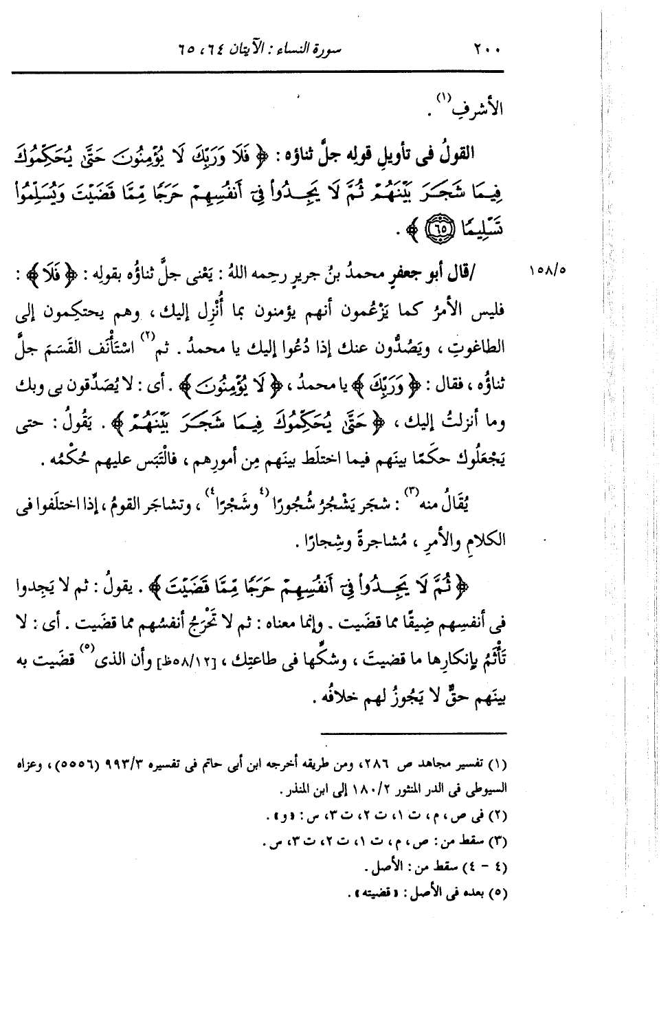 §الْقَوْلُ فِي تَأْوِيلِ قَوْلِهِ تَعَالَى: {فَلَا وَرَبِّكَ لَا يُؤْمِنُونَ حَتَّى يُحَكِّمُوكَ فِيمَا شَجَرَ بَيْنَهُمْ ثُمَّ لَا يَجِدُوا فِي أَنْفُسِهِمْ حَرَجًا مِمَّا قَضَيْتَ وَيُسَلِّمُوا تَسْلِيمًا} [النساء: 65] يَعْنِي جَلَّ ثَنَاؤُهُ بِقَوْلِهِ: {فَلَا} [البقرة: 22] فَلَيْسَ الْأَمْرُ كَمَا يَزْعُمُونَ أَنَّهُمْ يُؤْمِنُونَ بِمَا أُنْزِلَ إِلَيْكَ , وَهُمْ يَتَحَاكَمُونَ إِلَى الطَّاغُوتِ , وَيَصُدُّونَ عَنْكَ إِذَا دُعُوا إِلَيْكَ يَا مُحَمَّدُ. وَاسْتَأْنَفَ الْقَسَمَ جَلَّ ذِكْرُهُ , فَقَالَ: {وَرَبِّكَ} [النساء: 65] يَا مُحَمَّدُ {لَا يُؤْمِنُونَ} [البقرة: 6] أَيْ لَا يُصَدِّقُونَ بِي وَبِكَ , وَبِمَا أُنْزِلَ إِلَيْكَ {حَتَّى يُحَكِّمُوكَ فِيمَا شَجَرَ بَيْنَهُمْ} [النساء: 65] يَقُولُ: " حَتَّى يَجْعَلُوكَ حَكَمًا بَيْنَهُمْ فِيمَا اخْتَلَطَ بَيْنَهُمْ مِنْ أُمُورِهِمْ , فَالْتَبَسَ عَلَيْهِمْ حُكْمُهُ , يُقَالَ: شَجَرَ يَشْجُرُ شُجُورًا وَشَجَرًا , وَتَشَاجَرَ الْقَوْمُ إِذَا اخْتَلَفُوا فِي الْكَلَامِ وَالْأَمْرِ مُشَاجَرَةً وَشِجَارًا {ثُمَّ لَا يَجِدُوا فِي أَنْفُسِهِمْ حَرَجًا مِمَّا قَضَيْتَ} [النساء: 65] يَقُولُ: " لَا يَجِدُوا فِي أَنْفُسِهِمْ ضِيقًا مِمَّا قَضَيْتَ , وَإِنَّمَا مَعْنَاهُ: ثُمَّ لَا تَحَرَّجُ أَنْفُسُهُمْ مِمَّا قَضَيْتَ: أَيْ لَا تَأْثَمُ بِإِنْكَارِهَا مَا قَضَيْتَ وَشَكِّهَا فِي طَاعَتِكَ وَأَنَّ الَّذِي قَضَيْتَ بِهِ بَيْنَهُمْ حَقٌّ لَا يَجُوزُ لَهُمْ خِلَافُهُ.