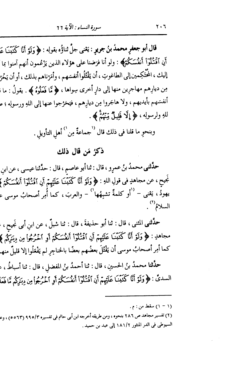 ذِكْرُ مَنْ قَالَ ذَلِكَ: حَدَّثَنِي مُحَمَّدُ بْنُ عَمْرٍو , قَالَ: ثنا أَبُو عَاصِمٍ , عَنْ عِيسَى , عَنِ ابْنِ أَبِي نَجِيحٍ , عَنْ مُجَاهِدٍ , فِي قَوْلِ اللَّهِ تَعَالَى: {§وَلَوْ أَنَّا كَتَبْنَا عَلَيْهِمْ أَنِ اقْتُلُوا أَنْفُسَكُمْ} [النساء: 66] هُمْ يَهُودُ يَعْنِي: وَالْعَرَبُ , كَمَا أُمِرَ أَصْحَابُ مُوسَى عَلَيْهِ السَّلَامُ "