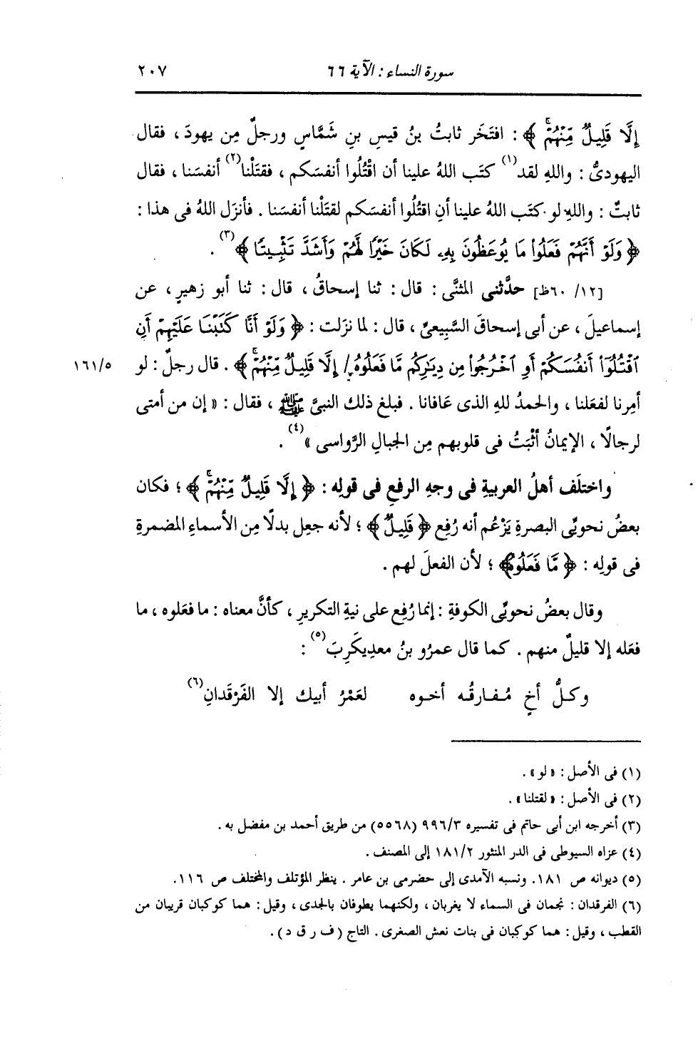 حَدَّثَنِي الْمُثَنَّى , قَالَ: ثنا إِسْحَاقُ , قَالَ: ثنا أَبُو زُهَيْرٍ , عَنْ إِسْمَاعِيلَ , عَنْ أَبِي إِسْحَاقَ السَّبِيعِيِّ , قَالَ: لَمَّا نَزَلَتْ: {§وَلَوْ أَنَّا كَتَبْنَا عَلَيْهِمْ أَنِ اقْتُلُوا أَنْفُسَكُمْ أَوِ اخْرُجُوا مِنْ دِيَارَكُمْ مَا فَعَلُوهُ إِلَّا قَلِيلٌ مِنْهُمْ} [النساء: 66] قَالَ رَجُلٌ: لَوْ أُمِرْنَا لَفَعَلْنَا , وَالْحَمْدُ لِلَّهِ الَّذِي عَافَانَا. فَبَلَغَ ذَلِكَ النَّبِيَّ صَلَّى اللهُ عَلَيْهِ وَسَلَّمَ , فَقَالَ: «إِنَّ مِنْ أُمَّتِي لَرِجَالًا الْإِيمَانُ أَثْبَتُ فِي قُلُوبِهِمْ مِنَ الْجِبَالِ الرَّوَاسِي» وَاخْتَلَفَ أَهْلُ الْعَرَبِيَّةِ فِي وَجْهِ الرَّفْعِ فِي قَوْلِهِ: {إِلَّا قَلِيلٌ مِنْهُمْ} [النساء: 66] فَكَانَ بَعْضُ نَحْوِيِّي الْبَصْرَةِ يَزْعُمُ أَنَّهُ رَفَعَ قَلِيلٌ لِأَنَّهُ جُعِلَ بَدَلًا مِنَ الْأَسْمَاءِ الْمُضَمَّرَةِ فِي قَوْلِهِ: {مَا فَعَلُوهُ} [النساء: 66] لِأَنَّ الْفِعْلَ لَهُمْ. وَقَالَ بَعْضُ نَحْوِيِّي الْكُوفَةِ: إِنَّمَا رُفِعَ عَلَى نِيَّةِ التَّكْرِيرِ , كَأَنَّ مَعْنَاهُ: مَا فَعَلُوهُ مَا فَعَلَهُ إِلَّا قَلِيلٌ مِنْهُمْ , كَمَا قَالَ عَمْرُو بْنُ مَعْدِ يكَرِبَ: