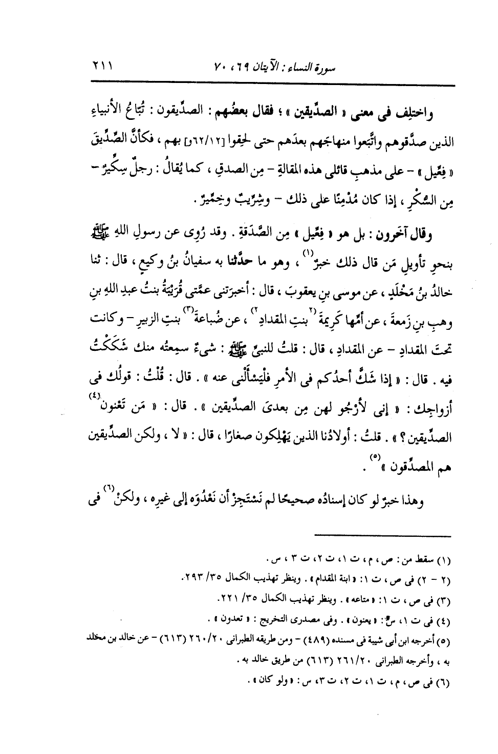 حَدَّثَنَا بِهِ , سُفْيَانُ بْنُ وَكِيعٍ قَالَ: ثنا خَالِدُ بْنُ مَخْلَدٍ , عَنْ مُوسَى بْنِ يَعْقُوبَ , قَالَ: أَخْبَرَتْنِي عَمَّتِي , قُرَيْبَةُ بِنْتُ عَبْدِ اللَّهِ بْنِ وَهْبِ بْنِ زَمْعَةَ , عَنْ أُمِّهَا , كَرِيمَةَ بِنْتِ الْمِقْدَادِ , عَنْ ضُبَاعَةَ بِنْتِ الزُّبَيْرِ , وَكَانَتْ تَحْتَ الْمِقْدَادِ عَنِ الْمِقْدَادِ , قَالَ: قُلْتُ لِلنَّبِيِّ صَلَّى اللهُ عَلَيْهِ وَسَلَّمَ: شَيْءٌ سَمِعْتُهُ مِنْكَ شَكَكْتُ فِيهِ. قَالَ: «إِذَا شَكَّ أَحَدُكُمْ فِي الْأَمْرِ فَلْيَسْأَلْنِي عَنْهُ» قَالَ: قُلْتُ: قَوْلُكَ فِي أَزْوَاجِكَ: إِنِّي لَأَرْجُو لَهُنَّ مِنْ بَعْدِي الصِّدِّيقِينَ؟ قَالَ: «مَنْ تَعْنُونَ الصِّدِّيقِينَ؟» قُلْتُ: أَوْلَادُنَا الَّذِينَ يَهْلِكُونَ صِغَارًا. قَالَ: «لَا , وَلَكِنَّ §الصِّدِّيقِينَ هُمُ الْمُصَدِّقُونَ» وَهَذَا خَبَرٌ لَوْ كَانَ إِسْنَادُهُ صَحِيحًا لَمْ نَسْتَجِزْ أَنْ نَعْدُوَهُ إِلَى غَيْرِهِ , وَلَوْ كَانَ فِي -[212]- إِسْنَادِهِ بَعْضُ مَا فِيهِ. فَإِذْ كَانَ ذَلِكَ كَذَلِكَ , فَالَّذِي هُوَ أَوْلَى بِالصِّدِّيقِ أَنْ يَكُونَ مَعْنَاهُ الْمُصَدِّقُ قَوْلَهُ بِفِعْلِهِ , إِذْ كَانَ الْفَعِيلُ فِي كَلَامِ الْعَرَبِ إِنَّمَا يَأْتِي إِذَا كَانَ مَأْخُوذًا مِنَ الْفِعْلِ بِمَعْنَى الْمُبَالَغَةِ , إِمَّا فِي الْمَدْحِ وَإِمَّا فِي الذَّمِّ , وَمِنْهُ قَوْلُهُ جَلَّ ثَنَاؤُهُ فِي صِفَةِ مَرْيَمَ: {وَأُمُّهُ صِدِّيقَةٌ} [المائدة: 75] وَإِذَا كَانَ مَعْنَى ذَلِكَ مَا وَصَفْنَا , كَانَ دَاخِلَا مَنْ كَانَ مَوْصُوفًا بِمَا قُلْنَا فِي صِفَةِ الْمُتَصَدِّقِينَ وَالْمُصَّدِّقِينَ؛ {وَالشُّهَدَاءِ} [النساء: 69] وَهُمْ جَمْعُ شَهِيدٍ: وَهُوَ الْمَقْتُولُ فِي سَبِيلِ اللَّهِ , سُمِّيَ بِذَلِكَ لِقِيَامِهِ بِشَهَادَةِ الْحَقِّ فِي جَنْبِ اللَّهِ حَتَّى قُتِلَ. {وَالصَّالِحِينَ} [النساء: 69] وَهُمْ جَمْعُ صَالِحٍ: وَهُوَ كُلُّ مَنْ صَلَحَتْ سَرِيرَتُهُ وَعَلَانِيَتُهُ. وَأَمَّا قَوْلُهُ جَلَّ ثَنَاؤُهُ: {وَحَسُنَ أُولَئِكَ رَفِيقًا} [النساء: 69] فَإِنَّهُ يَعْنِي: وَحَسُنَ هَؤُلَاءِ الَّذِينَ نَعَتَهُمْ وَوَصَفَهُمْ رُفَقَاءَ فِي الْجَنَّةِ. وَالرَّفِيقُ فِي لَفْظِ الْوَاحِدِ بِمَعْنَى الْجَمِيعِ , كَمَا قَالَ الشَّاعِرُ: