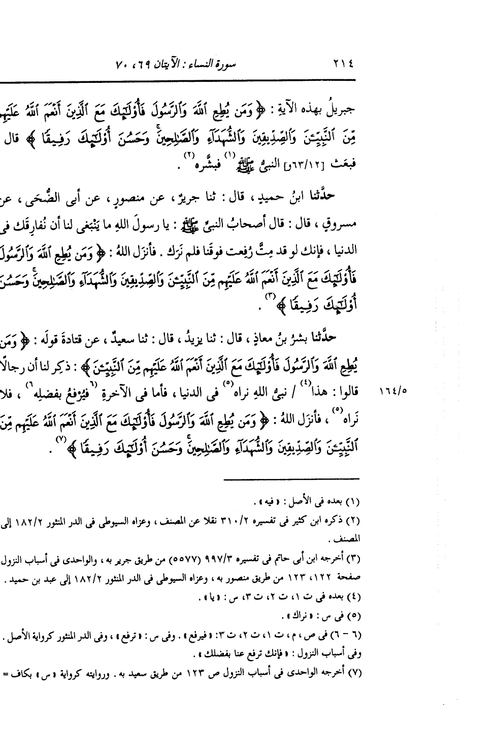 حَدَّثَنَا ابْنُ حُمَيْدٍ , قَالَ: ثنا جَرِيرٌ , عَنْ مَنْصُورٍ , عَنْ أَبِي الضُّحَى , عَنْ مَسْرُوقٍ , قَالَ: قَالَ أَصْحَابُ رَسُولِ اللَّهِ صَلَّى اللهُ عَلَيْهِ وَسَلَّمَ: يَا رَسُولَ اللَّهِ مَا يَنْبَغِي لَنَا أَنْ نُفَارِقَكَ فِي الدُّنْيَا , فَإِنَّكَ لَوْ قَدْ مُتَّ رُفِعْتَ فَوْقَنَا فَلَمْ نَرَكَ. فَأَنْزَلَ اللَّهُ: {§وَمَنْ يُطِعِ اللَّهَ وَالرَّسُولَ} [النساء: 69] الْآيَةُ "
