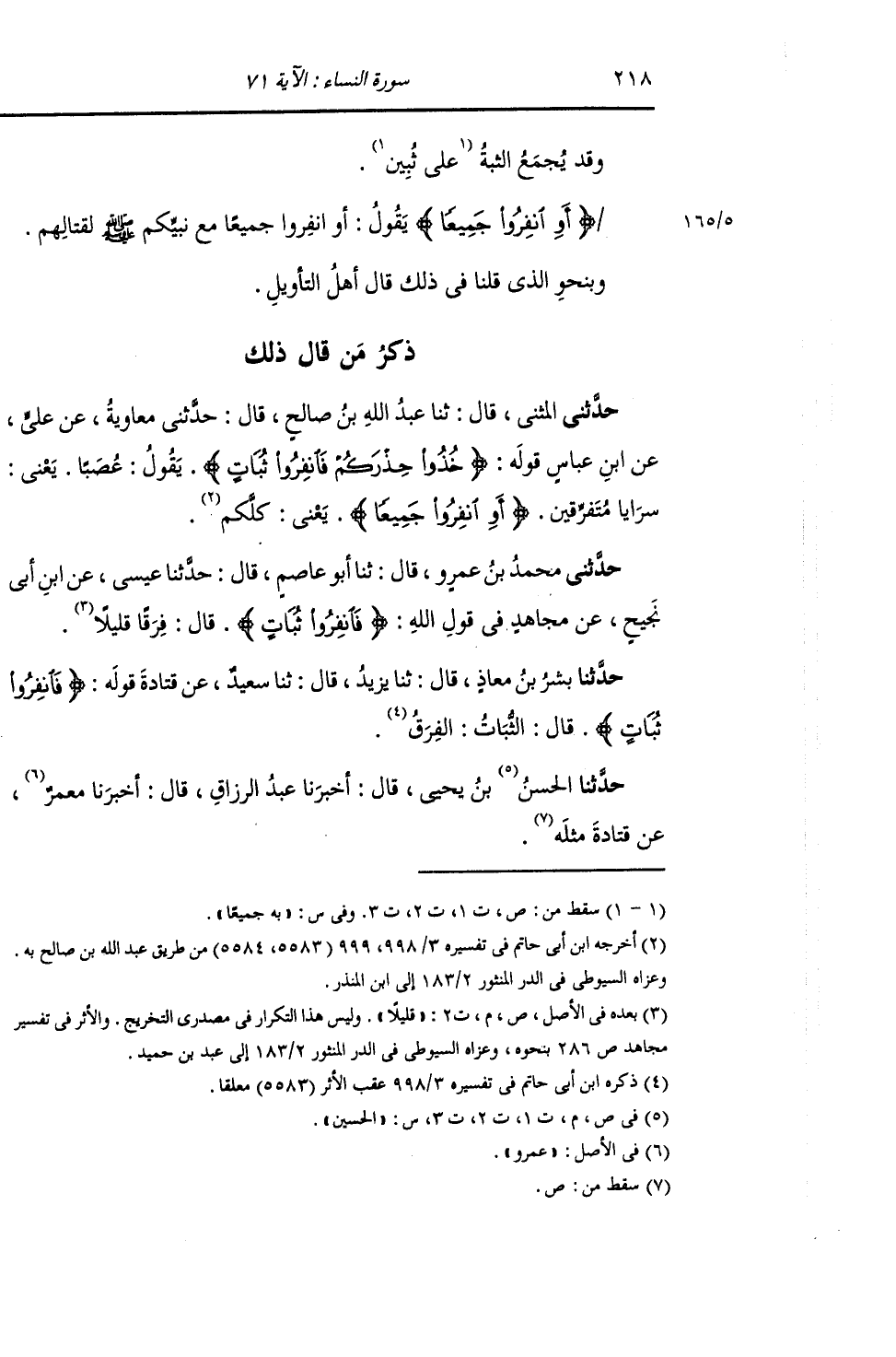 ذِكْرُ مَنْ قَالَ ذَلِكَ: حَدَّثَنِي الْمُثَنَّى , قَالَ: ثنا عَبْدُ اللَّهِ بْنُ صَالِحٍ , قَالَ: حَدَّثَنِي مُعَاوِيَةُ , عَنْ عَلِيِّ بْنِ أَبِي طَلْحَةَ , عَنِ ابْنِ عَبَّاسٍ , قَوْلُهُ: {§خُذُوا حِذْرَكُمْ فَانْفِرُوا ثُبَاتٍ} [النساء: 71] يَقُولُ: " عُصَبًا , يَعْنِي: سَرَايَا مُتَفَرِّقِينَ {أَوِ انْفِرُوا جَمِيعًا} [النساء: 71] يَعْنِي كُلَّكُمْ "