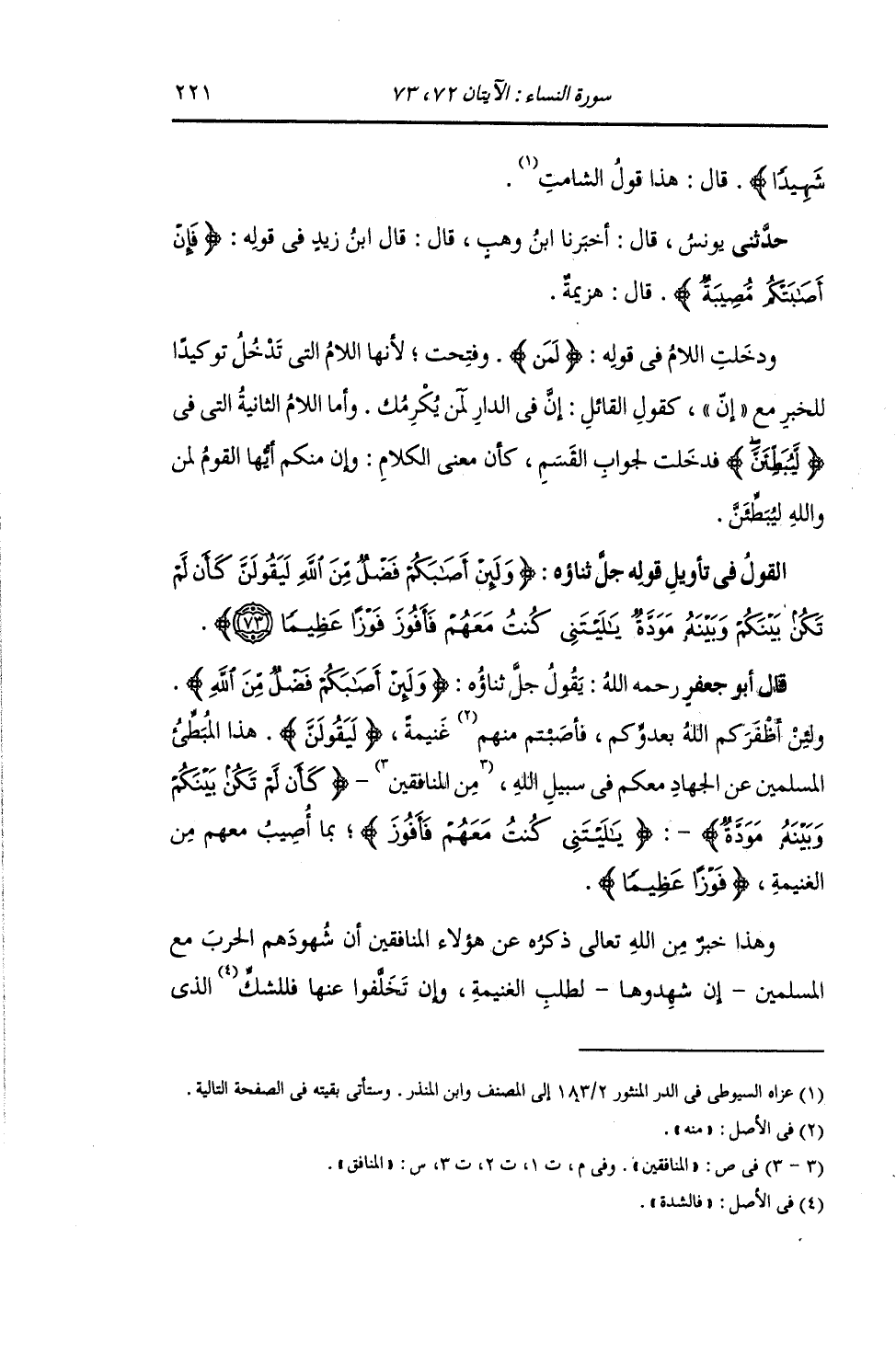 §الْقَوْلُ فِي تَأْوِيلِ قَوْلِهِ تَعَالَى: {وَلَئِنْ أَصَابَكُمْ فَضْلٌ مِنَ اللَّهِ لَيَقُولَنَّ كَأَنْ لَمْ تَكُنْ بَيْنَكُمْ وَبَيْنَهُ مَوَدَّةٌ يَا لَيْتَنِي كُنْتُ مَعَهُمْ فَأَفُوزَ فَوْزًا عَظِيمًا} [النساء: 73] يَقُولُ جَلَّ ثَنَاؤُهُ: {وَلَئِنْ أَصَابَكُمْ فَضْلٌ مِنَ اللَّهِ} [النساء: 73] وَلَئِنْ أَظْفَرَكُمُ اللَّهُ بِعَدُوِّكُمْ , فَأَصَبْتُمْ مِنْهُمْ غَنِيمَةً {لَيَقُولَنَّ} [النساء: 73] هَذَا الْمُبَطِّئُ الْمُسْلِمِينَ عَنِ الْجِهَادِ مَعَكُمْ فِي سَبِيلِ اللَّهِ الْمُنَافِقُ {كَأَنْ لَمْ تَكُنْ بَيْنَكُمْ وَبَيْنَهُ مَوَدَّةٌ يَا لَيْتَنِي كُنْتُ مَعَهُمْ فَأَفُوزَ} [النساء: 73] بِمَا أُصِيبُ مَعَهُمْ مِنَ الْغَنِيمَةَ {فَوْزًا عَظِيمًا} [النساء: 73] وَهَذَا خَبَرٌ مِنَ اللَّهِ تَعَالَى ذِكْرُهُ عَنْ هَؤُلَاءِ الْمُنَافِقِينَ أَنَّ شُهُودَهُمُ الْحَرْبَ مَعَ الْمُسْلِمِينَ إِنْ شَهِدُوهَا لِطَلَبِ الْغَنِيمَةِ , وَإِنْ تَخَلَّفُوا عَنْهَا فَلِلشَّكِّ الَّذِي