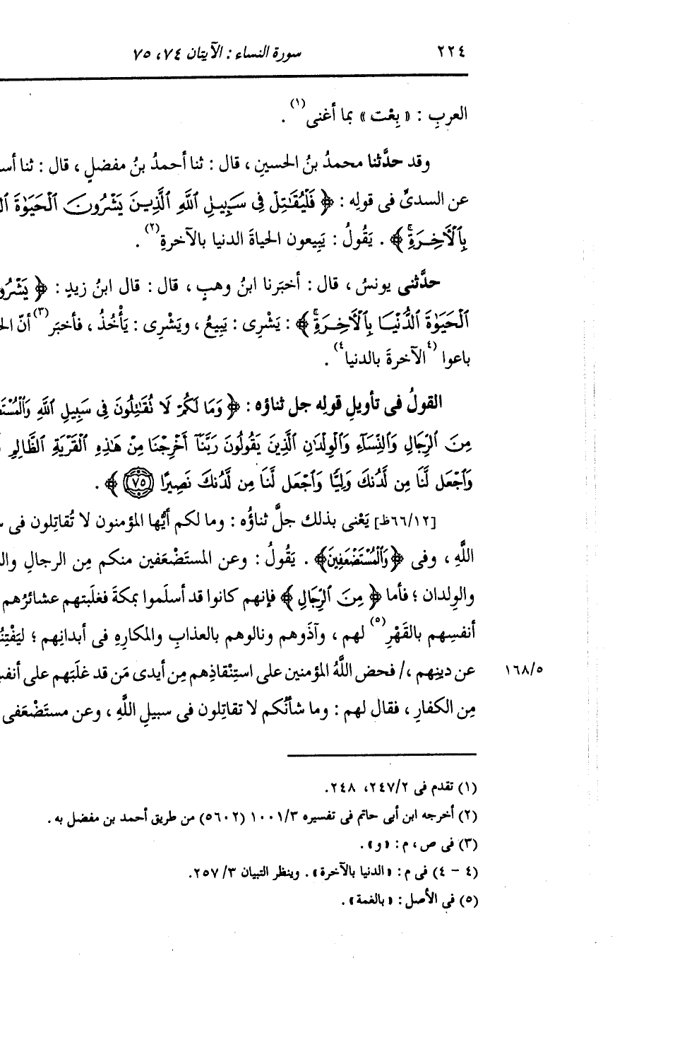 حَدَّثَنَا مُحَمَّدُ بْنُ الْحُسَيْنِ , قَالَ: ثنا أَحْمَدُ بْنُ مُفَضَّلٍ , قَالَ: ثنا أَسْبَاطٌ , عَنِ السُّدِّيِّ: {§فَلْيُقَاتِلْ فِي سَبِيلِ اللَّهِ الَّذِينَ يَشْرُونَ الْحَيَاةَ الدُّنْيَا بِالْآخِرَةِ} [النساء: 74] يَقُولُ: «يَبِيعُونَ الْحَيَاةَ الدُّنْيَا بِالْآخِرَةِ»
