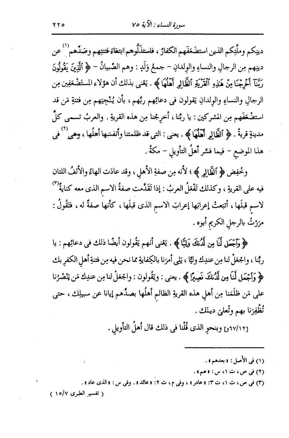 دِينِكُمْ وَمِلَّتِكُمُ الَّذِينَ قَدِ اسْتَضْعَفَهُمُ الْكُفَّارُ فَاسْتَذَلُّوهُمُ ابْتِغَاءَ فِتْنَتِهِمْ وَصَدِّهِمْ عَنْ دِينِهِمْ مِنَ الرِّجَالِ وَالنِّسَاءِ؟ وَالْوِلْدَانِ جَمْعُ وَلَدٍ: وَهُمُ الصِّبْيَانُ. {الَّذِينَ يَقُولُونَ رَبَّنَا أَخْرِجْنَا مِنْ هَذِهِ الْقَرْيَةِ الظَّالِمِ أَهْلُهَا} [النساء: 75] يَعْنِي بِذَلِكَ أَنَّ هَؤُلَاءِ الْمُسْتَضْعَفِينَ مِنَ الرِّجَالِ وَالنِّسَاءِ وَالْوِلْدَانِ يَقُولُونَ فِي دُعَائِهِمْ رَبَّهُمْ بِأَنْ يُنْجِيهِمْ مِنْ فِتْنَةِ مَنْ قَدِ اسْتَضْعَفَهُمْ مِنَ الْمُشْرِكِينَ: يَا رَبَّنَا أَخْرِجْنَا مِنْ هَذِهِ الْقَرْيَةِ الظَّالِمِ أَهْلُهَا , وَالْعَرَبُ تُسَمِّي كُلَّ مَدِينَةٍ قَرْيَةً , يَعْنِي: الَّتِي قَدْ ظَلَمَتْنَا وَأَنْفَسُهَا أَهْلُهَا. وَهِيَ فِي هَذَا الْمَوْضِعِ فِيمَا فَسَّرَ أَهْلُ التَّأْوِيلِ مَكَّةُ وَخَفَضَ الظَّالِمَ , لِأَنَّهُ مِنْ صِفَةِ الْأَهْلِ , وَقَدْ عَادَتِ الْهَاءُ وَالْأَلِفُ اللَّتَانِ فِيهِ عَلَى الْقَرْيَةِ , وَكَذَلِكَ تَفْعَلُ الْعَرَبُ إِذَا تَقَدَّمَتْ صِفَةُ الِاسْمِ الَّذِي مَعَهُ عَائِدٌ لِاسْمٍ قَبْلَهَا أَتْبَعَتْ إِعْرَابَهَا إِعْرَابَ الِاسْمِ الَّذِي قَبْلَهَا كَأَنَّهَا صِفَةٌ لَهُ , فَتَقُولُ: مَرَرْتُ بِالرَّجُلِ الْكَرِيمِ أَبُوهُ. {وَاجْعَلْ لَنَا مِنْ لَدُنْكَ وَلِيًّا} [النساء: 75] يَعْنِي أَنَّهُمْ يَقُولُونَ أَيْضًا فِي دُعَائِهِمْ: يَا رَبَّنَا وَاجْعَلْ لَنَا مِنْ عِنْدِكَ وَلِيًّا يَلِي أَمْرَنَا بِالْكِفَايَةِ مِمَّا نَحْنُ فِيهِ مِنْ فِتْنَةِ أَهْلِ الْكُفْرِ بِكَ {وَاجْعَلْ لَنَا مِنْ لَدُنْكَ نَصِيرًا} [النساء: 75] يَقُولُونَ: وَاجْعَلْ لَنَا مِنْ عِنْدِكَ مَنْ يَنُصُرُنَا عَلَى مَنْ ظَلَمَنَا مِنْ أَهْلِ هَذِهِ الْقَرْيَةِ الظَّالِمِ أَهْلُهَا , بِصَدِّهِمْ إِيَّانَا عَنْ سَبِيلِكَ حَتَّى تُظْفِرَنَا بِهِمْ وَنُعْلِيَ دِينَكَ. وَبِنَحْوِ الَّذِي قُلْنَا فِي ذَلِكَ قَالَ أَهْلُ التَّأْوِيلِ