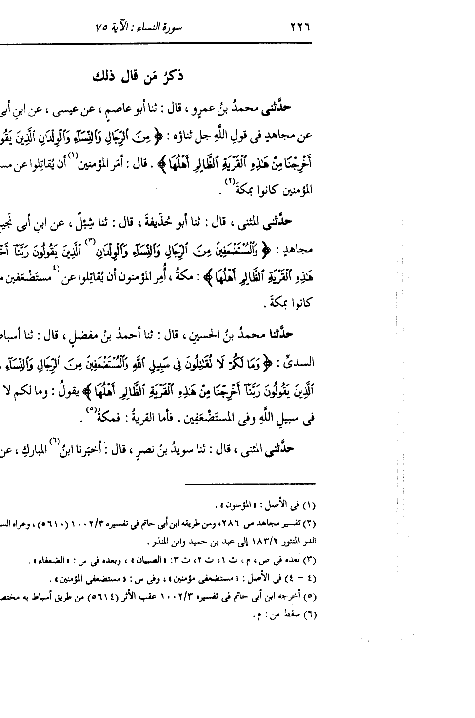 حَدَّثَنِي الْمُثَنَّى , قَالَ: ثنا سُوَيْدُ بْنُ نَصْرٍ , قَالَ: أَخْبَرَنَا الْمُبَارَكُ , عَنْ -[227]- عُثْمَانَ بْنِ عَطَاءٍ , عَنْ أَبِيهِ , عَنِ ابْنِ عَبَّاسٍ , فِي قَوْلِهِ: {§وَمَا لَكُمْ لَا تُقَاتِلُونَ فِي سَبِيلِ اللَّهِ وَالْمُسْتَضْعَفِينَ} [النساء: 75] قَالَ: «وَفِي الْمُسْتَضْعَفِينَ»