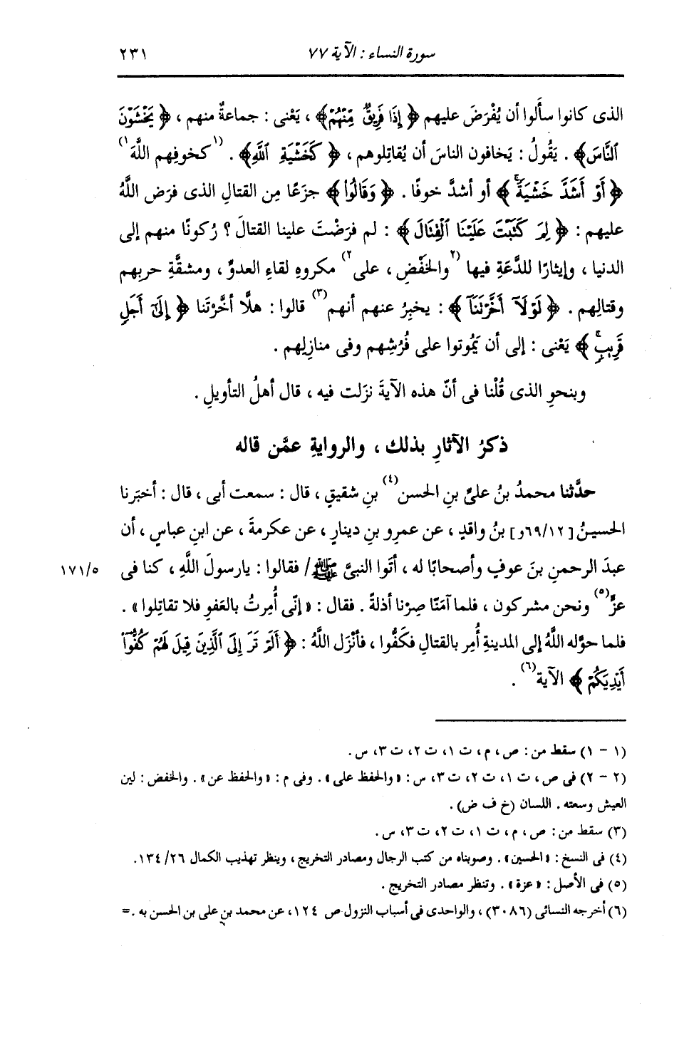 الْقِتَالُ الَّذِي كَانُوا سَأَلُوا أَنْ يُفْرَضَ عَلَيْهِمْ {إِذَا فَرِيقٌ مِنْهُمْ} [النساء: 77] يَعْنِي: " جَمَاعَةٌ مِنْهُمْ {يَخْشَوْنَ النَّاسَ} [النساء: 77] يَقُولُ: " يَخَافُونَ النَّاسَ أَنْ يُقَاتِلُوهُمْ {كَخَشْيَةِ اللَّهِ أَوْ أَشَدَّ خَشْيَةً} [النساء: 77] أَوْ أَشَدَّ خَوْفًا. وَقَالُوا: جَزَعًا مِنَ الْقِتَالِ الَّذِي فَرَضَ اللَّهُ عَلَيْهِمْ {لِمَ كَتَبْتَ عَلَيْنَا الْقِتَالَ} [النساء: 77] لِمَ فَرَضْتَ عَلَيْنَا الْقِتَالَ , رُكُونًا مِنْهُمْ إِلَى الدُّنْيَا , وَإِيثَارًا لِلدَّعَةِ فِيهَا وَالْخَفْضِ , عَلَى مَكْرُوهِ لِقَاءِ الْعَدُوِّ وَمَشَقَّةِ حَرْبِهِمْ وَقِتَالِهِمْ {لَوْلَا أَخَّرْتَنَا} [النساء: 77] يُخْبِرُ عَنْهُمْ قَالُوا: هَلَا أَخَّرْتَنَا {إِلَى أَجَلٍ قَرِيبٍ} [النساء: 77] يَعْنِي إِلَى أَنْ يَمُوتُوا عَلَى فُرُشِهِمْ وَفِي مَنَازِلِهِمْ وَبِنَحْوِ الَّذِي قُلْنَا إِنَّ هَذِهِ الْآيَةَ نَزَلَتْ فِيهِ قَالَ أَهْلُ التَّأْوِيلِ. ذِكْرُ الْآثَارِ بِذَلِكَ , وَالرِّوَايَةِ عَمَّنْ قَالَهُ: