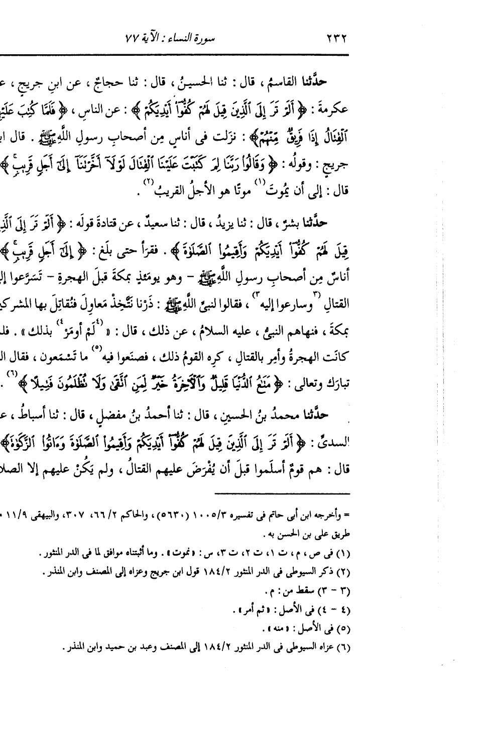 حَدَّثَنَا الْقَاسِمُ , قَالَ: ثنا الْحُسَيْنُ , قَالَ: ثني حَجَّاجٌ , عَنِ ابْنِ جُرَيْجٍ , عَنْ عِكْرِمَةَ: {§أَلَمْ تَرَ إِلَى الَّذِينَ قِيلَ لَهُمْ كُفُّوا أَيْدِيَكُمْ} [النساء: 77] عَنِ النَّاسِ {فَلَمَّا كُتِبَ عَلَيْهِمُ الْقِتَالُ إِذَا فَرِيقٌ مِنْهُمْ} [النساء: 77] نَزَلَتْ فِي أُنَاسٍ مِنْ أَصْحَابِ رَسُولِ اللَّهِ صَلَّى اللهُ عَلَيْهِ وَسَلَّمَ. قَالَ ابْنُ جُرَيْجٍ: وَقَوْلُهُ: {وَقَالُوا رَبَّنَا لِمَ كَتَبْتَ عَلَيْنَا الْقِتَالَ لَوْلَا أَخَّرْتَنَا إِلَى أَجَلٍ قَرِيبٍ} [النساء: 77] قَالَ: «إِلَى أَنْ نَمُوتَ مَوْتًا هُوَ الْأَجَلُ الْقَرِيبُ»