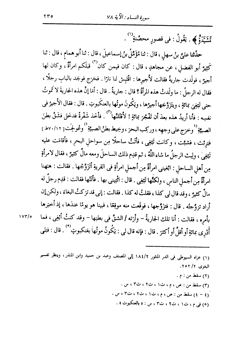حَدَّثَنِي عَلِيُّ بْنُ سَهْلٍ , قَالَ: ثنا مُؤَمَّلُ بْنُ إِسْمَاعِيلَ , قَالَ: ثنا أَبُو هَمَّامٍ , قَالَ: ثنا كَثِيرٌ أَبُو الْفَضْلِ , عَنْ مُجَاهِدٍ , قَالَ: كَانَ فِيمَنْ قَبْلَكُمُ امْرَأَةٌ , وَكَانَ لَهَا أَجِيرٌ , فَوَلَدَتْ جَارِيَةً فَقَالَتْ لِأَجِيرِهَا: اقْتَبِسْ لَنَا نَارًا. فَخَرَجَ فَوَجَدَ بِالْبَابِ رَجُلًا , فَقَالَ لَهُ الرَّجُلُ: مَا وَلَدَتْ هَذِهِ الْمَرْأَةُ؟ قَالَ: جَارِيَةً قَالَ: أَمَا إِنَّ هَذِهِ الْجَارِيَةَ لَا تَمُوتُ حَتَّى تَبْغِيَ بِمِائَةٍ , وَيَتَزَوَّجَهَا أَجِيرُهَا , وَيَكُونَ مَوْتُهَا بِالْعَنْكَبُوتِ. قَالَ: فَقَالَ الْأَجِيرُ فِي نَفْسِهِ: فَأَنَا أُرِيدُ هَذِهِ بَعْدَ أَنْ تَفْجُرَ بِمِائَةٍ. فَأَخَذَ شَفْرَةً فَدَخَلَ , فَشَقَّ بَطْنَ الصَّبِيَّةِ. وعُولِجَتْ فَبَرِئَتْ , فَشَبَّتْ , وَكَانَتْ تَبْغِي , فَأَتَتْ سَاحِلًا مِنْ سَوَاحِلِ الْبَحْرِ , فَأَقَامَتْ عَلَيْهِ تَبْغِي. ولَبِثَ الرَّجُلُ مَا شَاءَ اللَّهُ , ثُمَّ قَدِمَ ذَلِكَ السَّاحِلَ وَمَعَهُ مَالٌ كَثِيرٌ , فَقَالَ لِامْرَأَةٍ مِنْ أَهْلِ السَّاحِلِ: ابْغِينِي امْرَأَةً مِنْ أَجْمَلِ امْرَأَةٍ فِي الْقَرْيَةِ أَتَزَوَّجُهَا. فَقَالَتْ: هَهُنَا امْرَأَةٌ مِنْ أَجْمَلِ النَّاسِ , وَلَكِنَّهَا تَبْغِي. قَالَ: ائْتِنِي بِهَا. فَأَتَتْهَا فَقَالَتْ: قَدْ قَدِمَ رَجُلٌ لَهُ مَالٌ كَثِيرٌ , وَقَدْ قَالَ لِي كَذَا , فَقُلْتُ لَهُ كَذَا. فَقَالَتْ: إِنِّي قَدْ تَرَكْتُ الْبِغَاءَ , وَلَكِنْ إِنْ أَرَادَ تَزَوَّجْتُهُ. قَالَ: فَتَزَوَّجَهَا , فَوَقَعَتْ مِنْهُ مَوْقِعًا , فَبَيْنَا هُوَ يَوْمًا عِنْدَهَا , إِذْ أَخْبَرَهَا بِأَمْرِهِ , فَقَالَتْ: أَنَا تِلْكَ الْجَارِيَةُ , وَأَرَتْهُ الشِّقَّ فِي بَطْنِهَا , وَقَدْ كُنْتُ أَبْغِي , فَمَا أَدْرِي بِمِائَةٍ أَوْ أَقَلَّ أَوْ أَكْثَرَ؛ قَالَ: فَإِنَّهُ قَالَ لِي: يَكُونُ مَوْتُهَا بِالْعَنْكَبُوتِ. قَالَ: فَبَنَى -[236]- لَهَا بُرْجًا بِالصَّحَرَاءِ وَشَيَّدَهُ. فبَيْنَمَا هُمَا يَوْمًا فِي ذَلِكَ الْبُرْجِ , إِذَا عَنْكَبُوتٌ فِي السَّقْفِ فَقَالَتْ: هَذَا يَقْتُلُنِي؟ لَا يَقْتُلُهُ أَحَدٌ غَيْرِي. فحَرَّكَتْهُ فَسَقَطَ , فَأَتَتْهُ فَوَضَعَتْ إِبْهَامَ رِجْلِهَا عَلَيْهِ فَشَدَخَتْهُ , وَسَاحَ سُمُّهُ بَيْنَ ظُفْرِهَا وَاللَّحْمِ , فَاسْوَدَّتْ رِجْلُهَا فَمَاتَتْ , فَنَزَلَتْ هَذِهِ الْآيَةُ: {§أَيْنَمَا تَكُونُوا يُدْرِكْكُمُ الْمَوْتُ وَلَوْ كُنْتُمْ فِي بُرُوجٍ مُشَيَّدَةٍ} [النساء: 78] "