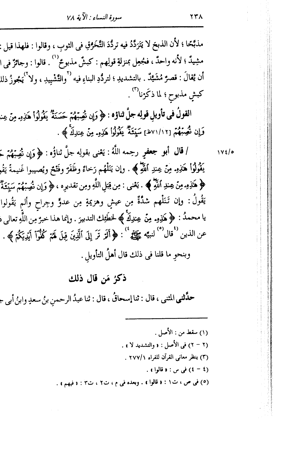 ذِكْرُ مَنْ قَالَ ذَلِكَ: حَدَّثَنِي الْمُثَنَّى , قَالَ: ثنا إِسْحَاقُ , قَالَ: ثنا عَبْدُ الرَّحْمَنِ بْنُ سَعْدٍ , وَابْنُ أَبِي -[239]- جَعْفَرٍ قَالَا: ثنا أَبُو جَعْفَرٍ , عَنِ الرَّبِيعِ , عَنْ أَبِي الْعَالِيَةِ , فِي قَوْلِهِ: {§وَإِنْ تُصِبْهُمْ حَسَنَةٌ يَقُولُوا هَذِهِ مِنْ عِنْدِ اللَّهِ وَإِنْ تُصِبْهُمْ سَيِّئَةٌ يَقُولُوا هَذِهِ مِنْ عِنْدِكَ} [النساء: 78] قَالَ: «هَذِهِ فِي السَّرَّاءِ وَالضَّرَّاءِ» حَدَّثَنَا الْقَاسِمُ قَالَ: ثنا الْحُسَيْنُ قَالَ: ثني حَجَّاجٌ , عَنْ أَبِي جَعْفَرٍ , عَنِ الرَّبِيعِ , عَنْ أَبِي الْعَالِيَةِ مِثْلَهُ
