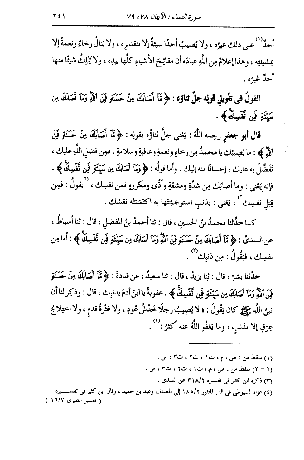 §الْقَوْلُ فِي تَأْوِيلِ قَوْلِهِ تَعَالَى: {مَا أَصَابَكَ مِنْ حَسَنَةٍ فَمِنَ اللَّهِ وَمَا أَصَابَكَ مِنْ سَيِّئَةٍ فَمِنْ نَفْسِكَ وَأَرْسَلْنَاكَ لِلنَّاسِ رَسُولًا وَكَفَى بِاللَّهِ شَهِيدًا} [النساء: 79] يَعْنِي جَلَّ ثَنَاؤُهُ بِقَوْلِهِ: {مَا أَصَابَكَ مِنْ حَسَنَةٍ فَمِنَ اللَّهِ وَمَا أَصَابَكَ مِنْ سَيِّئَةٍ فَمِنْ نَفْسِكَ} [النساء: 79] مَا يُصِيبُكَ يَا مُحَمَّدُ مِنْ رَخَاءٍ وَنِعْمَةٍ وَعَافِيَةٍ وَسَلَامَةٍ , فَمِنْ فَضْلِ اللَّهِ عَلَيْكَ يَتَفَضَّلُ بِهِ عَلَيْكَ إِحْسَانًا مِنْهُ إِلَيْكَ. وَأَمَّا قَوْلُهُ: {وَمَا أَصَابَكَ مِنْ سَيِّئَةٍ فَمِنْ نَفْسِكَ} [النساء: 79] يَعْنِي: " وَمَا أَصَابَكَ مِنْ شِدَّةٍ وَمَشَقَّةٍ وَأَذًى وَمَكْرُوهٍ , فَمِنْ نَفْسِكَ , يَعْنِي: بِذَنْبٍ اسْتَوْجَبْتَهَا بِهِ اكْتَسَبَتْهُ نَفْسُكَ. كَمَا:
