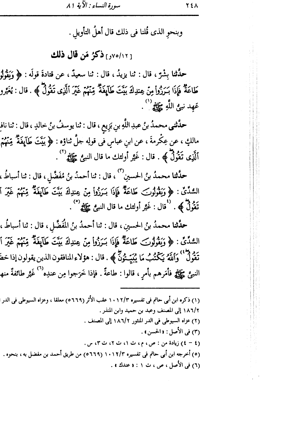 حَدَّثَنَا مُحَمَّدُ بْنُ الْحُسَيْنِ , قَالَ: ثني أَحْمَدُ بْنُ مُفَضَّلٍ قَالَ: ثنا أَسْبَاطٌ , عَنِ السُّدِّيِّ: {§وَيَقُولُونَ طَاعَةٌ فَإِذَا بَرَزُوا مِنْ عِنْدِكَ بَيَّتَ طَائِفَةٌ مِنْهُمْ غَيْرَ الَّذِي تَقُولُ} [النساء: 81] قَالَ: «غَيَّرَ أُولَئِكَ مَا قَالَ النَّبِيُّ صَلَّى اللهُ عَلَيْهِ وَسَلَّمَ»