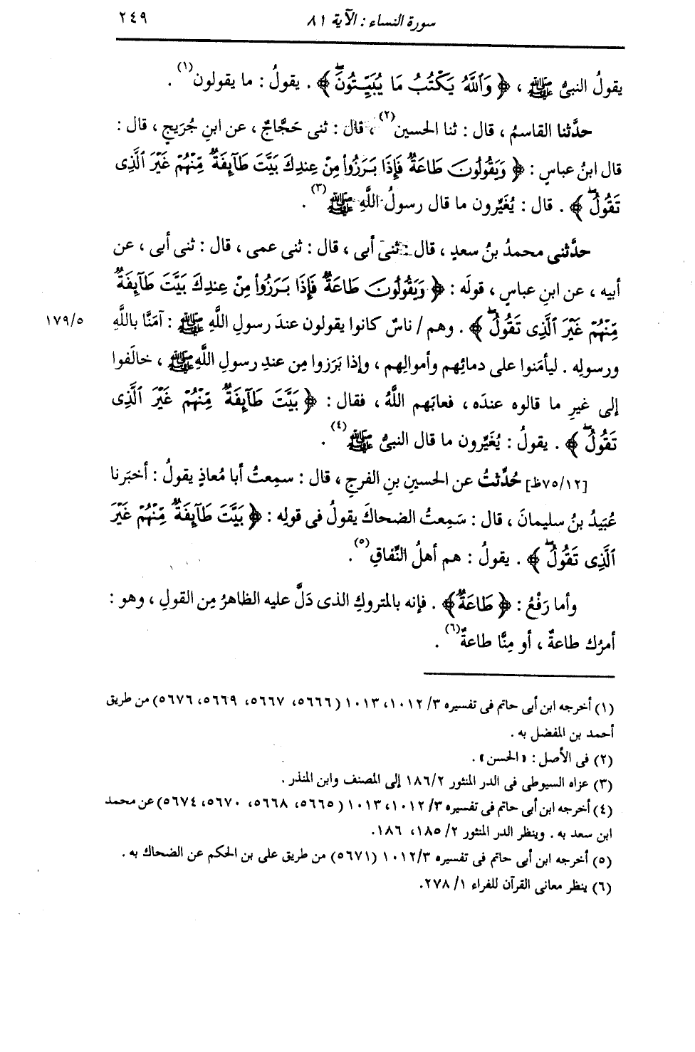 حَدَّثَنِي مُحَمَّدُ بْنُ سَعْدٍ , قَالَ: ثني أَبِي قَالَ: ثني عَمِّي قَالَ: ثني أَبِي عَنْ أَبِيهِ , عَنِ ابْنِ عَبَّاسٍ , قَوْلُهُ: {§وَيَقُولُونَ طَاعَةٌ فَإِذَا بَرَزُوا مِنْ عِنْدِكَ بَيَّتَ طَائِفَةٌ مِنْهُمْ غَيْرَ الَّذِي تَقُولُ} [النساء: 81] وَهُمْ نَاسٌ كَانُوا يَقُولُونَ عِنْدَ رَسُولِ اللَّهِ صَلَّى اللهُ عَلَيْهِ وَسَلَّمَ آمَنَّا بِاللَّهِ وَرَسُولِهِ لِيَأْمَنُوا عَلَى دِمَائِهِمْ وَأَمْوَالِهِمْ , فَإِذَا بَرَزُوا مِنْ عِنْدِ رَسُولِ اللَّهِ صَلَّى اللهُ عَلَيْهِ وَسَلَّمَ خَالَفُوا إِلَى غَيْرِ مَا قَالُوا عِنْدَهُ؛ فَعَابَهُمُ اللَّهُ , فَقَالَ: {بَيَّتَ طَائِفَةٌ مِنْهُمْ غَيْرَ الَّذِي تَقُولُ} [النساء: 81] يَقُولُ: «يُغَيِّرُونَ مَا قَالَ النَّبِيُّ صَلَّى اللهُ عَلَيْهِ وَسَلَّمَ»
