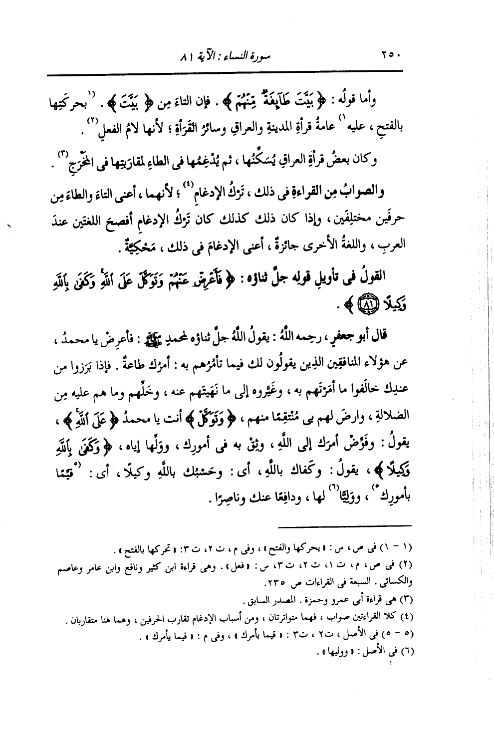 وَأَمَّا قَوْلُهُ: {بَيَّتَ طَائِفَةٌ} [النساء: 81] فَإِنَّ التَّاءَ مِنْ بَيَّتَ تُحَرِّكُهَا بِالْفَتْحِ عَامَّةُ قُرَّاءِ الْمَدِينَةِ وَالْعِرَاقِ وَسَائِرُ الْقُرَّاءَ , لِأَنَّهَا لَامُ فَعَّلَ. وَكَانَ بَعْضُ قُرَّاءِ الْعِرَاقِ يُسَكِّنُهَا ثُمَّ يُدْغِمُهَا فِي الطَّاءِ لِمُقَارَبَتِهَا فِي الْمَخْرَجِ. قَالَ أَبُو جَعْفَرٍ: وَالصَّوَابُ مِنَ الْقِرَاءَةِ فِي ذَلِكَ , تَرْكُ الْإِدْغَامِ لِأَنَّهَا , أَعْنِي التَّاءَ وَالطَّاءَ , مِنْ حَرْفَيْنِ مُخْتَلِفَيْنِ؛ وَإِذَا كَانَ كَذَلِكَ كَانَ تَرْكُ الْإِدْغَامِ أَفْصَحَ اللُّغَتَيْنِ عِنْدَ الْعَرَبِ , وَاللُّغَةُ الْأُخْرَى جَائِزَةٌ , أَعْنِي الْإِدْغَامَ فِي ذَلِكَ , مَحْكِيَّةٌ