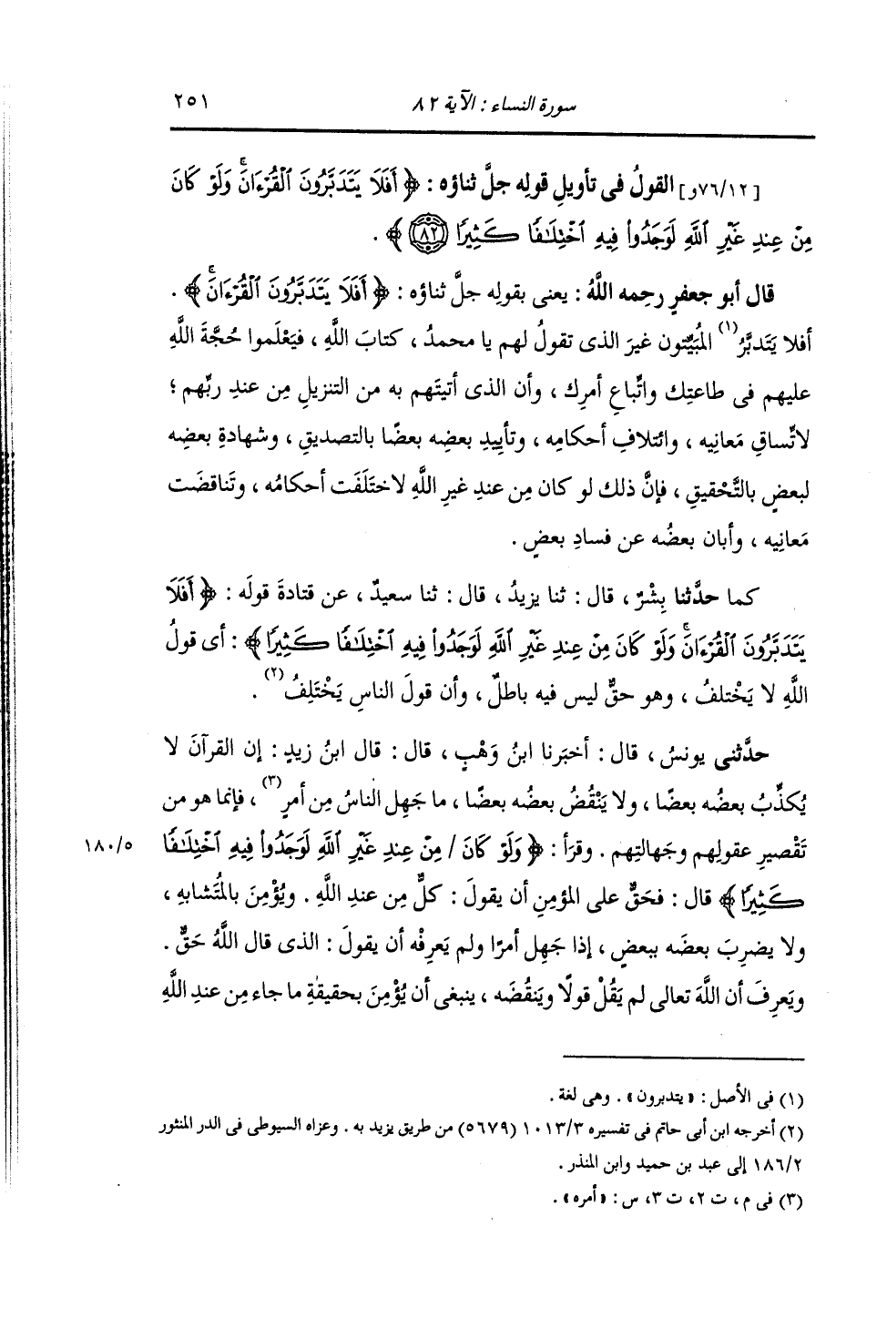 حَدَّثَنَا بِشْرُ بْنُ مُعَاذٍ , قَالَ: ثنا يَزِيدُ , قَالَ: ثنا سَعِيدٌ , عَنْ قَتَادَةَ , قَوْلُهُ: {§أَفَلَا يَتَدَبَّرُونَ الْقُرْآنَ وَلَوْ كَانَ مِنْ عِنْدِ غَيْرِ اللَّهِ لَوَجَدُوا فِيهِ اخْتِلَافًا كَثِيرًا} [النساء: 82] أَيْ قَوْلُ اللَّهِ لَا يَخْتَلِفُ , وَهُوَ حَقٌّ لَيْسَ فِيهِ بَاطِلٌ , وَإِنَّ قَوْلَ النَّاسِ يَخْتَلِفُ "