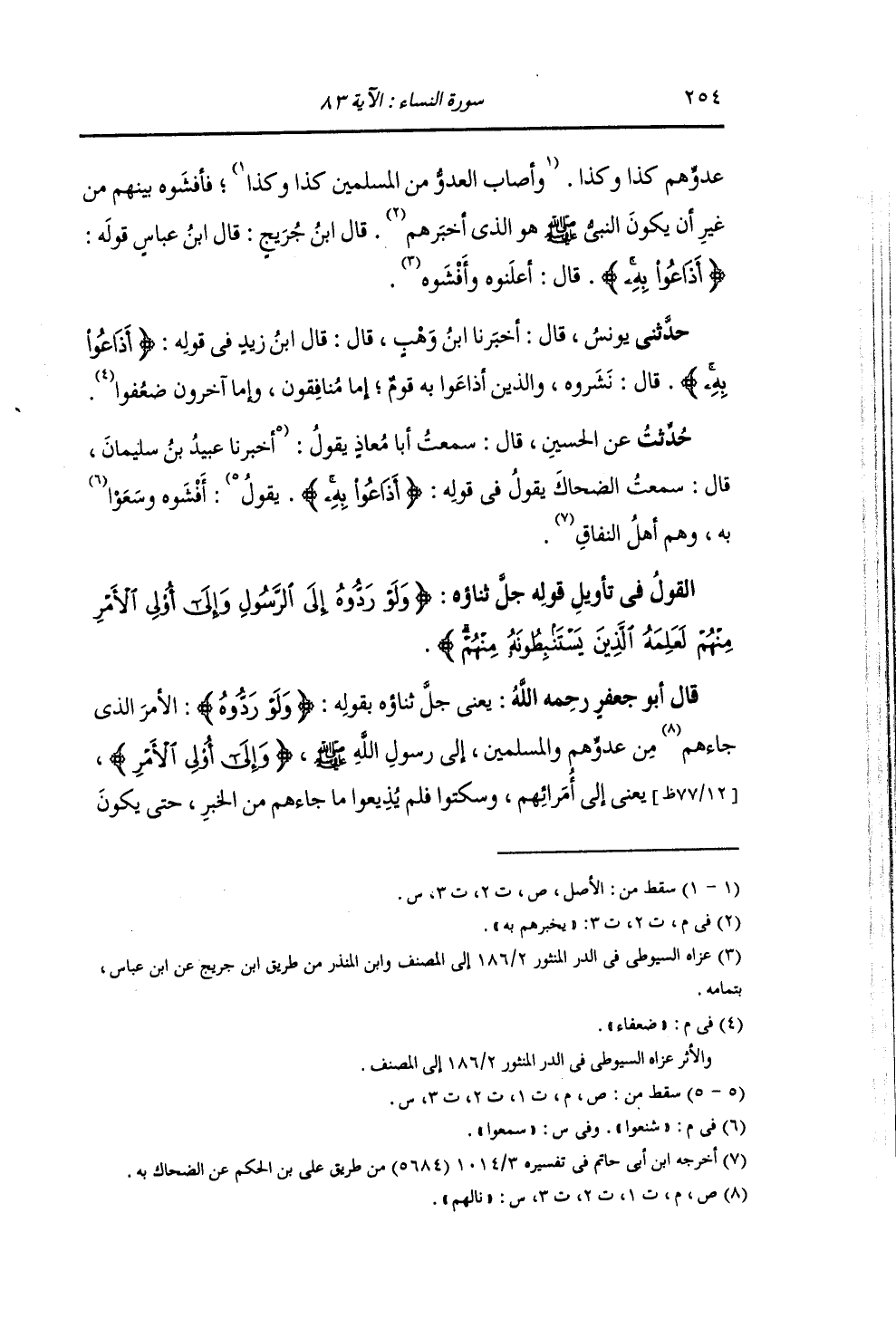 §الْقَوْلُ فِي تَأْوِيلِ قَوْلِهِ تَعَالَى: {وَلَوْ رَدُّوهُ إِلَى الرَّسُولِ وَإِلَى أُولِي الْأَمْرِ مِنْهُمْ لَعَلِمَهُ الَّذِينَ يَسْتَنْبِطُونَهُ مِنْهُمْ} [النساء: 83] يَعْنِي جَلَّ ثَنَاؤُهُ بِقَوْلِهِ: وَلَوْ رَدُّوهُ: الْأَمْرَ الَّذِي نَالَهُمْ مِنْ عَدُوِّهِمْ وَالْمُسْلِمِينَ إِلَى رَسُولِ اللَّهِ صَلَّى اللهُ عَلَيْهِ وَسَلَّمَ , وَإِلَى أُولِي أَمْرِهِمْ , يَعْنِي: وَإِلَى أُمَرَائِهِمْ , وَسَكَتُوا فَلَمْ يُذِيعُوا مَا جَاءَهُمْ مِنَ الْخَبَرِ , حَتَّى يَكُونَ