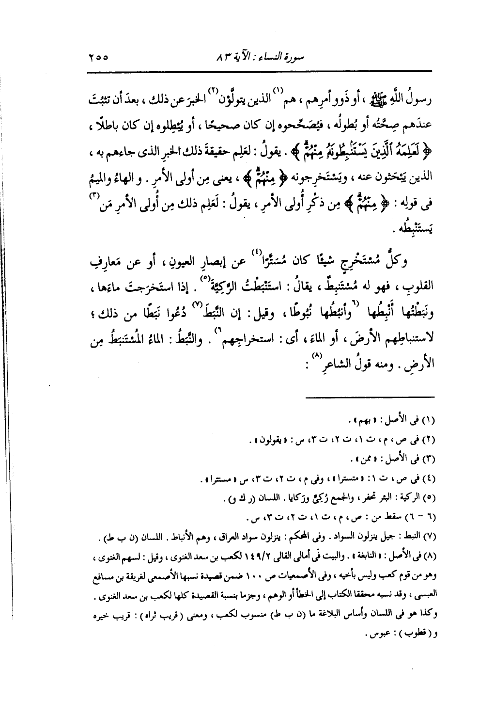 رَسُولُ اللَّهِ صَلَّى اللهُ عَلَيْهِ وَسَلَّمَ أَوْ ذَوُو أَمْرِهِمْ هُمُ الَّذِينَ يَقُولُونَ الْخَبَرَ عَنْ ذَلِكَ , بَعْدَ أَنْ ثَبَتَتْ عِنْدَهُمْ صِحَّتُهُ أَوْ بُطُولُهُ , فَيُصَحِّحُوهُ إِنْ كَانَ صَحِيحًا , أَوْ يُبْطِلُوهُ إِنْ كَانَ بَاطِلًا {لَعَلِمَهُ الَّذِينَ يَسْتَنْبِطُونَهُ مِنْهُمْ} [النساء: 83] يَقُولُ: " لَعَلِمَ حَقِيقَةَ ذَلِكَ الْخَبَرِ الَّذِي جَاءَهُمْ بِهِ الَّذِينَ يَبْحَثُونَ عَنْهُ , وَيَسْتَخْرِجُونَهُ مِنْهُمْ , يَعْنِي: أُولِي الْأَمْرِ. وَالْهَاءُ وَالْمِيمُ فِي قَوْلِهِ: {مِنْهُمْ} [البقرة: 75] مِنْ ذِكْرِ أُولِي الْأَمْرِ. يَقُولُ: لَعَلِمَ ذَلِكَ مِنْ أُولِي الْأَمْرِ مَنْ يَسْتَنْبِطُهُ. وَكُلُّ مُسْتَخْرِجٍ شَيْئًا كَانَ مُسْتَتِرًا عَنْ أَبْصَارِ الْعُيُونِ أَوْ عَنْ مَعَارِفِ الْقُلُوبِ , فَهُوَ لَهُ مُسْتَنْبِطٌ , يُقَالَ: اسْتَنْبَطْتُ الرَّكِيَّةَ: إِذَا اسْتَخْرَجْتُ مَاءَهَا , وَنَبَطْتُهَا أُنْبِطُهَا , وَالنَّبَطُ: الْمَاءُ الْمُسْتَنْبَطُ مِنَ الْأَرْضِ , وَمِنْهُ قَوْلُ الشَّاعِرِ