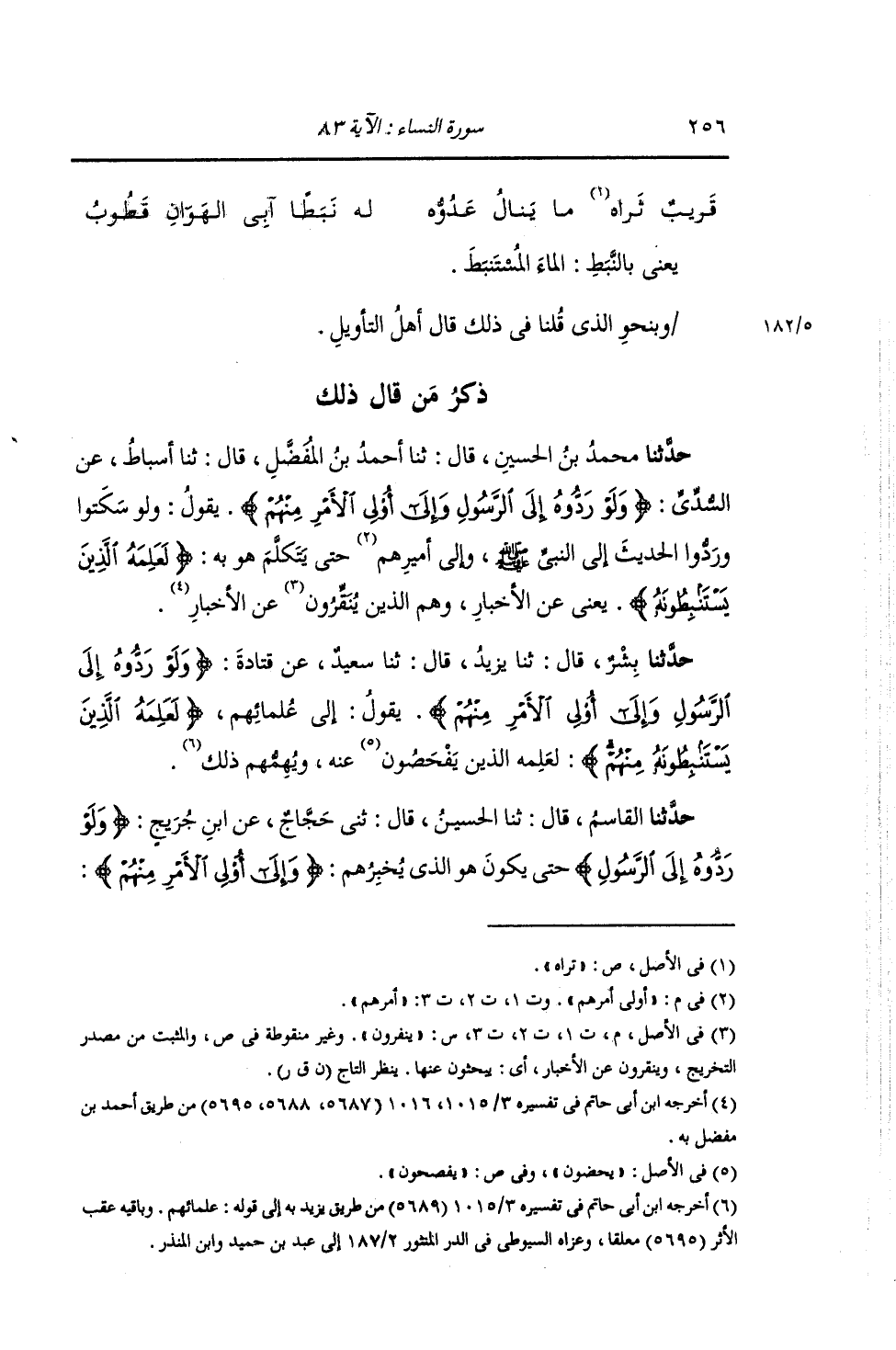 ذِكْرُ مَنْ قَالَ ذَلِكَ: حَدَّثَنِي مُحَمَّدُ بْنُ الْحُسَيْنِ , قَالَ: ثنا أَحْمَدُ بْنُ مُفَضَّلٍ , قَالَ: ثنا أَسْبَاطٌ , عَنِ السُّدِّيِّ: {§وَلَوْ رَدُّوهُ إِلَى الرَّسُولِ وَإِلَى أُولِي الْأَمْرِ مِنْهُمْ} [النساء: 83] يَقُولُ: " وَلَوْ سَكَتُوا وَرَدُّوا الْحَدِيثَ إِلَى النَّبِيِّ صَلَّى اللهُ عَلَيْهِ وَسَلَّمَ وَإِلَى أُولِي أَمْرِهِمْ حَتَّى يَتَكَلَّمَ هُوَ بِهِ {لَعَلِمَهُ الَّذِينَ يَسْتَنْبِطُونَهُ} [النساء: 83] يَعْنِي عَنِ الْأَخْبَارِ , وَهُمُ الَّذِينَ يُنَقِّرُونَ عَنِ الْأَخْبَارِ "