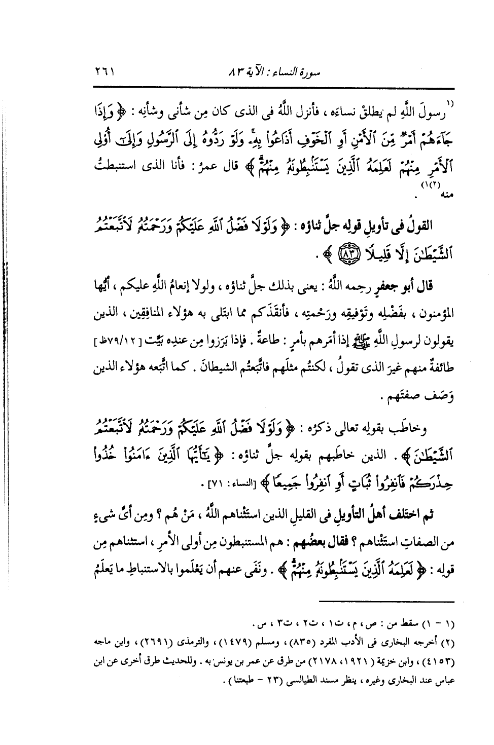 §الْقَوْلُ فِي تَأْوِيلِ قَوْلِهِ تَعَالَى: {وَلَوْلَا فَضْلُ اللَّهِ عَلَيْكُمْ وَرَحْمَتُهُ لَاتَّبَعْتُمُ الشَّيْطَانَ إِلَّا قَلِيلًا} [النساء: 83] يَعْنِي بِذَلِكَ جَلَّ ثَنَاؤُهُ: وَلَوْلَا إِنْعَامُ اللَّهِ عَلَيْكُمْ أَيُّهَا الْمُؤْمِنُونَ بِفَضْلِهِ وَتَوْفِيقِهِ وَرَحْمَتِهِ , فَأَنْقَذَكُمْ مِمَّا ابْتَلَى هَؤُلَاءِ الْمُنَافِقِينَ بِهِ , الَّذِينَ يَقُولُونَ لِرَسُولِ اللَّهِ صَلَّى اللهُ عَلَيْهِ وَسَلَّمَ إِذَا أَمَرَهُمْ بِأَمْرٍ: طَاعَةٌ , فَإِذَا بَرَزُوا مِنْ عِنْدِهِ بَيَّتَ طَائِفَةٌ مِنْهُمْ غَيْرَ الَّذِي تَقُولُ , لَكُنْتُمْ مِثْلَهُمْ , فَاتَّبَعْتُمُ الشَّيْطَانَ إِلَّا قَلِيلًا , كَمَا اتَّبَعَهُ الَّذِينَ وَصَفَ صِفَتَهُمْ. وَخَاطَبَ بِقَوْلِهِ تَعَالَى ذِكْرُهُ: {وَلَوْلَا فَضْلُ اللَّهِ عَلَيْكُمْ وَرَحْمَتُهُ لَاتَّبَعْتُمُ الشَّيْطَانَ} [النساء: 83] الَّذِينَ خَاطَبَهُمْ بِقَوْلِهِ جَلَّ ثَنَاؤُهُ: {يَا أَيُّهَا الَّذِينَ آمَنُوا خُذُوا حِذْرَكُمْ فَانْفِرُوا ثَبَاتٍ أَوِ انْفِرُوا جَمِيعًا} [النساء: 71] ثُمَّ اخْتَلَفَ أَهْلُ التَّأْوِيلِ فِي الْقَلِيلِ الَّذِي اسْتَثْنَاهُمْ فِي هَذِهِ الْآيَةِ , مَنْ هُمْ وَمِنْ أَيِّ شَيْءٍ مِنَ الصِّفَاتِ اسْتَثْنَاهُمْ؟ فَقَالَ بَعْضُهُمْ: هُمُ الْمُسْتَنْبِطُونَ مِنْ أُولِي الْأَمْرِ , اسْتَثْنَاهُمْ مِنْ قَوْلِهِ: {لَعَلِمَهُ الَّذِينَ يَسْتَنْبِطُونَهُ مِنْهُمْ} [النساء: 83] وَنَفَى عَنْهُمْ أَنْ يَعْلَمُوا بِالِاسْتِنْبَاطِ مَا يَعْلَمُ