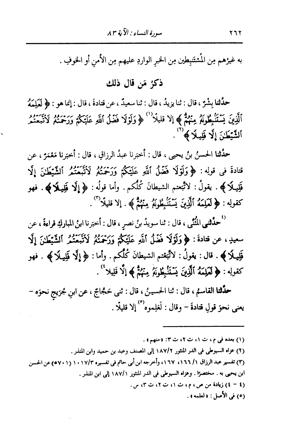 حَدَّثَنَا الْحَسَنُ بْنُ يَحْيَى , قَالَ: أَخْبَرَنَا عَبْدُ الرَّزَّاقِ , قَالَ: أَخْبَرَنَا مَعْمَرٌ , عَنْ قَتَادَةَ , فِي قَوْلِهِ: {§وَلَوْلَا فَضْلُ اللَّهِ عَلَيْكُمْ وَرَحْمَتُهُ لَاتَّبَعْتُمُ الشَّيْطَانَ إِلَّا قَلِيلًا} [النساء: 83] يَقُولُ: " لَاتَّبَعْتُمُ الشَّيْطَانَ كُلُّكُمْ. وَأَمَّا قَوْلُهُ: {إِلَّا قَلِيلًا} [البقرة: 83] فَهُوَ كَقَوْلِهِ: {لَعَلِمَهُ الَّذِينَ يَسْتَنْبِطُونَهُ مِنْهُمْ} [النساء: 83] إِلَّا قَلِيلًا "