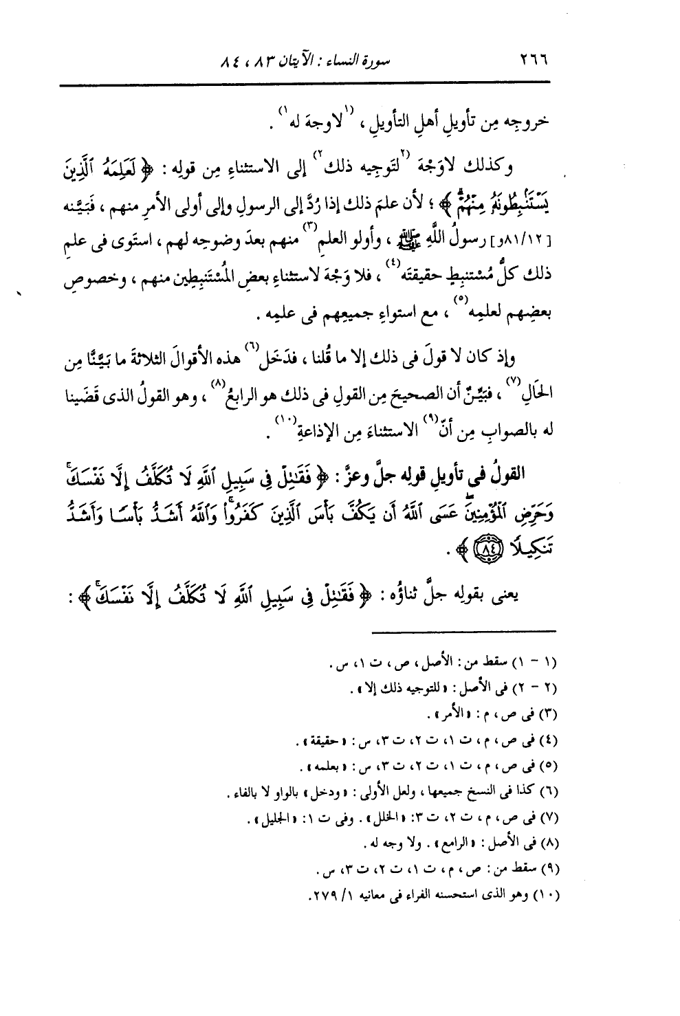 §الْقَوْلُ فِي تَأْوِيلِ قَوْلِهِ تَعَالَى: {فَقَاتِلْ فِي سَبِيلِ اللَّهِ لَا تُكَلَّفُ إِلَّا نَفْسَكَ وَحَرِّضِ الْمُؤْمِنِينَ عَسَى اللَّهُ أَنْ يَكُفَّ بَأْسَ الَّذِينَ كَفَرُوا وَاللَّهُ أَشَدُّ بَأْسًا وَأَشَدُّ تَنْكِيلًا} [النساء: 84] يَعْنِي بِقَوْلِهِ جَلَّ ثَنَاؤُهُ: {فَقَاتِلْ فِي سَبِيلِ اللَّهِ لَا تُكَلَّفُ إِلَّا نَفْسَكَ} [النساء: 84]