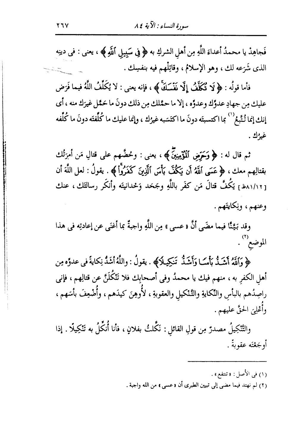 فَجَاهِدْ يَا مُحَمَّدُ أَعْدَاءَ اللَّهِ مِنْ أَهْلِ الشِّرْكِ بِهِ فِي سَبِيلِ اللَّهِ , يَعْنِي: فِي دِينِهِ الَّذِي شَرَعَهُ لَكَ , وَهُوَ الْإِسْلَامُ , وَقَاتِلْهُمْ فِيهِ بِنَفْسِكَ. فَأَمَّا قَوْلُهُ: {لَا تُكَلَّفُ إِلَّا نَفْسَكَ} [النساء: 84] فَإِنَّهُ يَعْنِي: لَا يُكَلِّفُكَ اللَّهُ فِيمَا فَرَضَ عَلَيْكَ مِنْ جِهَادِ عَدُوِّهِ وَعَدُوِّكَ , إِلَّا مَا حَمَّلَكَ مِنْ ذَلِكَ دُونَ مَا حَمَّلَ غَيْرَكَ مِنْهُ: أَيْ إِنَّكَ إِنَّمَا تُتْبَعُ بِمَا اكْتَسَبْتَهُ دُونَ مَا اكْتَسَبَهُ غَيْرُكَ , وَإِنَّمَا عَلَيْكَ مَا كُلِّفْتَهُ دُونَ مَا كُلِّفَهُ غَيْرُكَ. ثُمَّ قَالَ لَهُ: {وَحَرِّضِ الْمُؤْمِنِينَ} [النساء: 84] يَعْنِي: " وَحُضَّهُمْ عَلَى قِتَالِ مَنْ أَمَرْتُكَ بِقِتَالِهِمْ مَعَكَ. {عَسَى اللَّهُ أَنْ يَكُفَّ بَأْسَ الَّذِينَ كَفَرُوا} [النساء: 84] يَقُولُ: " لَعَلَّ اللَّهَ أَنْ يَكُفَّ قِتَالَ مَنْ كَفَرَ بِاللَّهِ وَجَحَدَ وَحْدَانِيَّتَهُ , وَأَنْكَرَ رِسَالَتَكَ عَنْكَ وَعَنْهُمْ وَنِكَايَتَهُمْ وَقَدْ بَيَّنَّا فِيمَا مَضَى أَنَّ عَسَى مِنَ اللَّهِ وَاجِبَةٌ بِمَا أَغْنَى عَنْ إِعَادَتِهِ فِي هَذَا الْمَوْضِعِ {وَاللَّهُ أَشَدُّ بَأْسًا وَأَشَدُّ تَنْكِيلًا} [النساء: 84] يَقُولُ: " وَاللَّهُ أَشَدُّ نِكَايَةً فِي عَدُوِّهِ مِنْ أَهْلِ الْكُفْرِ بِهِ مِنْهُمْ فِيكَ يَا مُحَمَّدُ وَفِي أَصْحَابِكَ , فَلَا تَنْكُلَنَّ عَنْ قِتَالِهِمْ , فَإِنِّي رَاصِدُهُمْ بِالْبَأْسِ وَالنِّكَايَةِ وَالتَّنْكِيلِ وَالْعُقُوبَةِ , لَأُوهِنَ كَيْدَهُمْ وَأُضْعِفَ بَأْسَهُمْ وَأُعْلِيَ الْحَقَّ عَلَيْهِمْ. وَالتَّنْكِيلُ مَصْدَرٌ مِنْ قَوْلِ الْقَائِلِ: نَكَّلْتُ بِفُلَانٍ , فَأَنَا أُنَكِّلُ بِهِ تَنْكِيلًا: إِذَا أَوْجَعْتُهُ عُقُوبَةً.